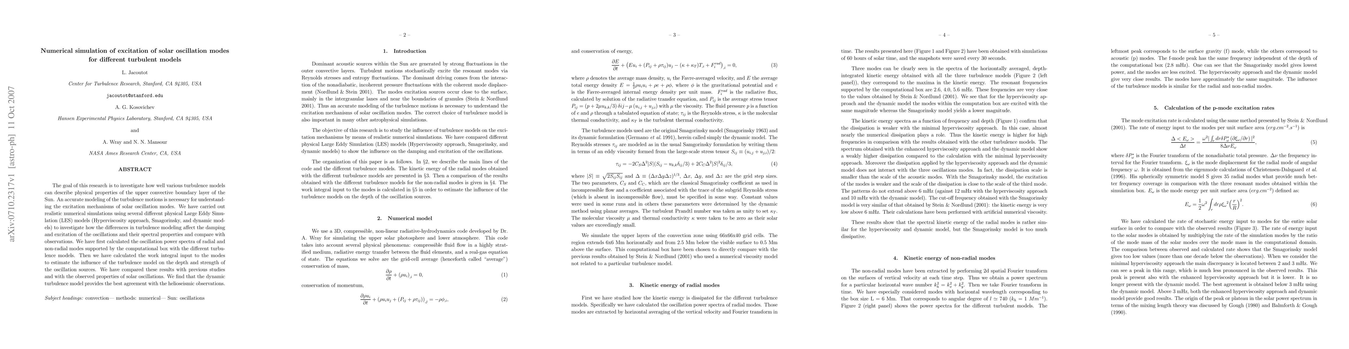 Numerical simulations using different turbulence models show that dynamic models provide the best agreement with observed solar oscillation properties, outperforming hyperviscosity and Smagorinsky models.