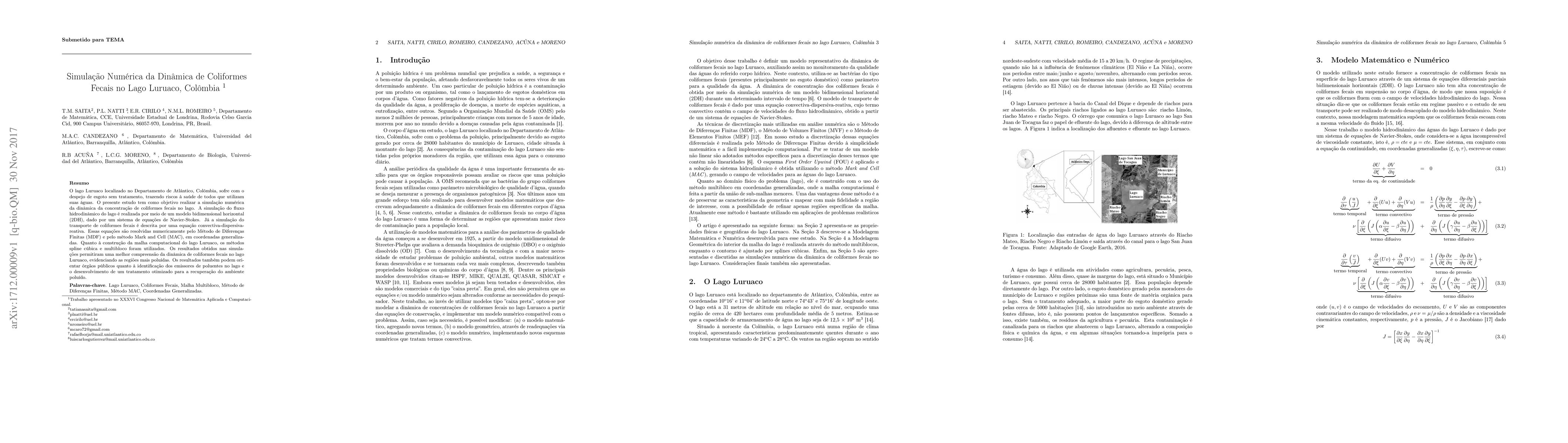 This study numerically simulates fecal coliform dynamics in Luruaco Lake, Colombia, using a 2DH hydrodynamic model and a convective-dispersive-reactive equation. The Finite Difference Method and MAC method solve these equations, identifying pollution hotspots and aiding agencies in pinpointing polluters and planning treatment for environmental recovery.