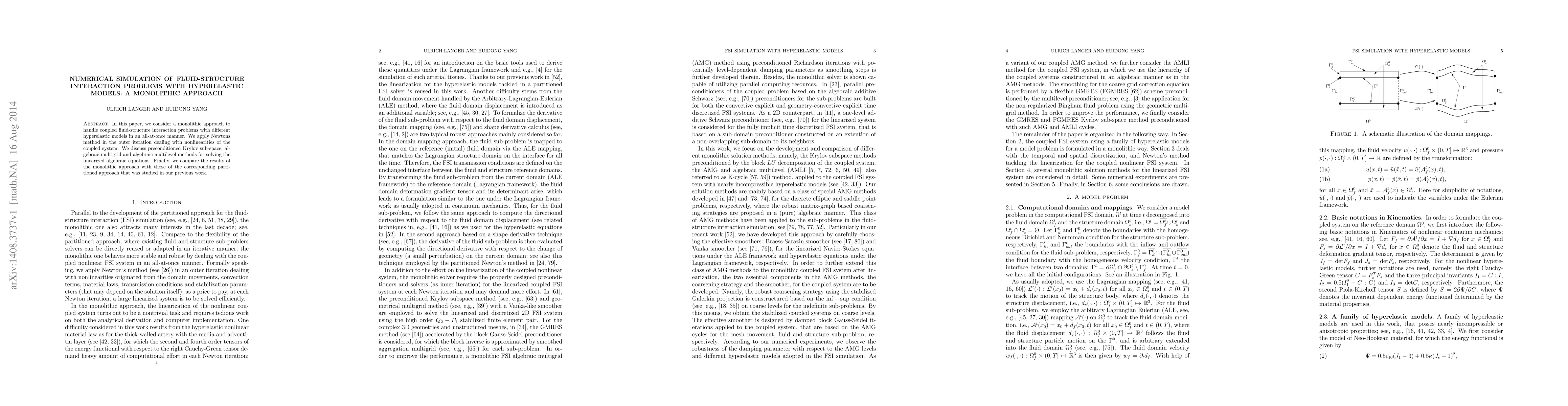 This paper presents a monolithic approach for solving fluid-structure interaction problems using hyperelastic models, employing Newton's method to handle nonlinearities. It compares the efficiency of this method with a previously studied partitioned approach.