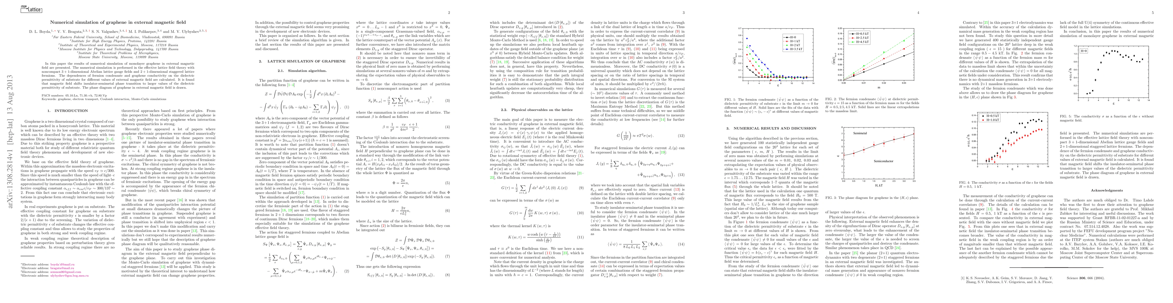 The paper presents a detailed numerical simulation approach using staggered lattice fermions and noncompact lattice gauge fields to study graphene's behavior under external magnetic fields, providing insights into its phase transition and conductivity.