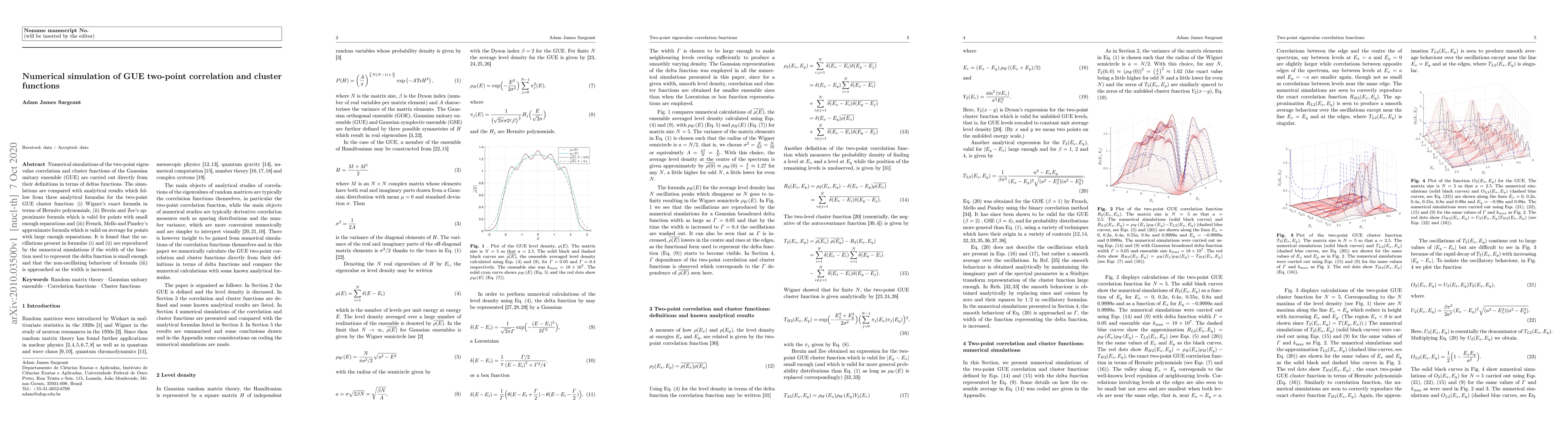 Numerical simulations of GUE two-point correlation and cluster functions match analytical formulas for small width, and non-oscillating behavior is achieved with increasing width.