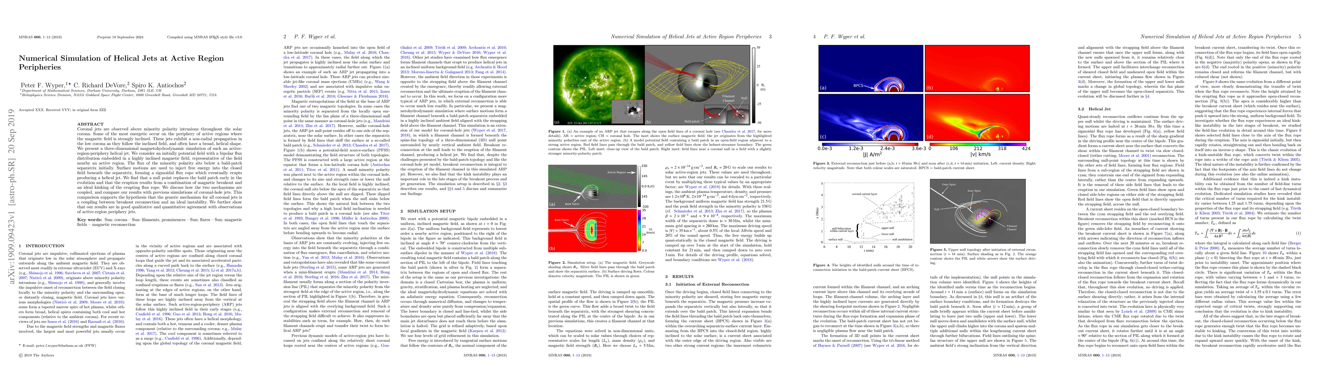 This paper presents a 3D magnetohydrodynamic simulation of helical jets at active region peripheries, showing that their formation involves a combination of magnetic breakout and ideal kinking. The study supports the hypothesis that these mechanisms are coupled and generally applicable to coronal jets, with results matching observations.