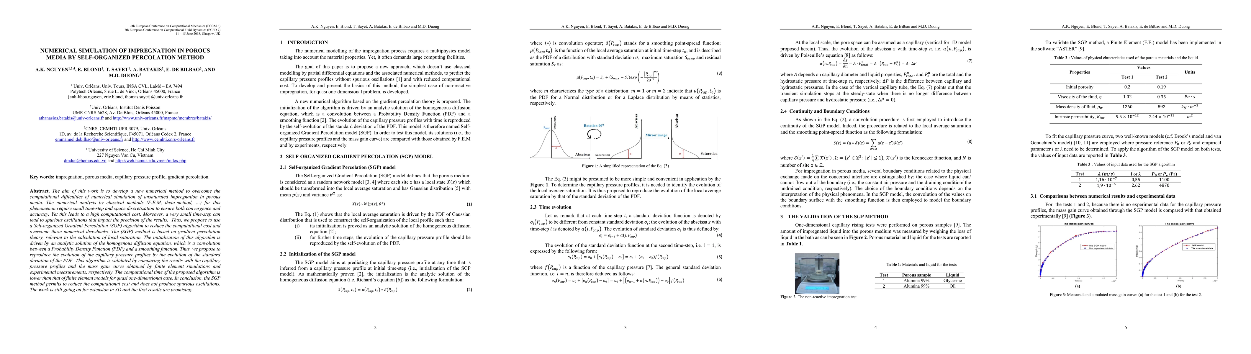 This paper introduces a Self-organized Gradient Percolation (SGP) method to simulate unsaturated impregnation in porous media, aiming to reduce computational costs and avoid spurious oscillations. The SGP method, validated against finite element simulations and experiments, shows lower computational time and improved precision compared to traditional methods.