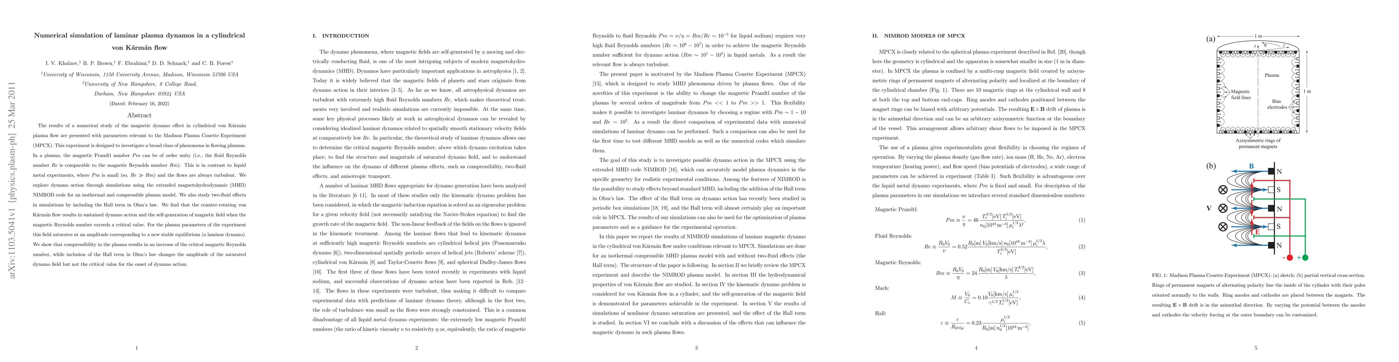 This paper presents numerical simulations of laminar plasma dynamos in cylindrical von Kármán flow, relevant to the Madison Plasma Couette Experiment, showing that sustained dynamo action can occur when the magnetic Reynolds number exceeds a critical value, leading to a self-generated magnetic field in a stable laminar equilibrium. Compressibility increases the critical magnetic Reynolds number, while the Hall term affects the dynamo field amplitude.