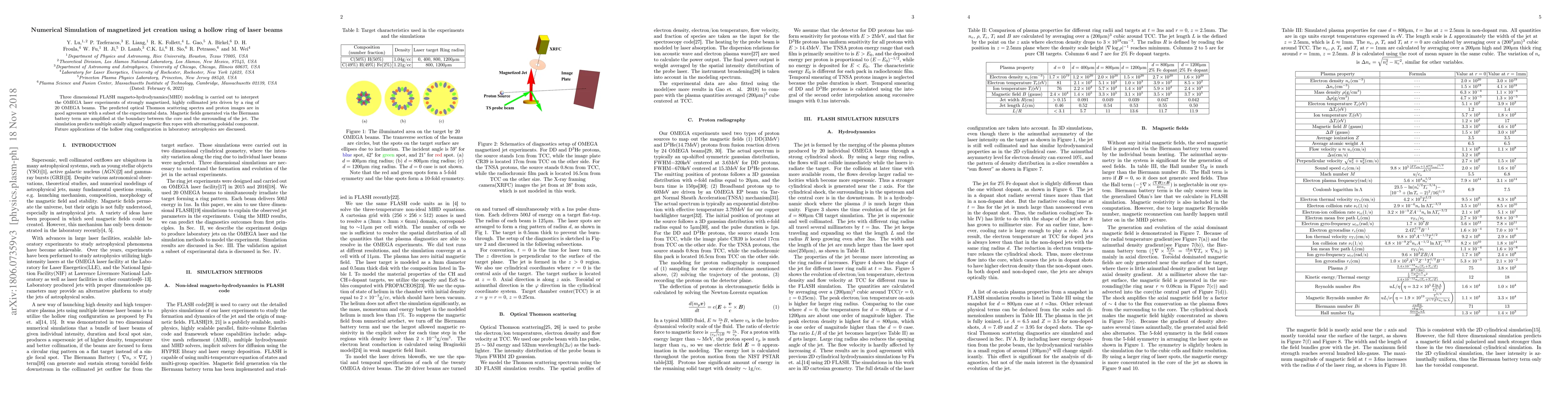 The paper presents detailed 3D MHD simulations of magnetized jet creation using a hollow ring laser configuration, revealing new features such as the 'sunflower' density pattern and alternating para-axial magnetic field bundles.
