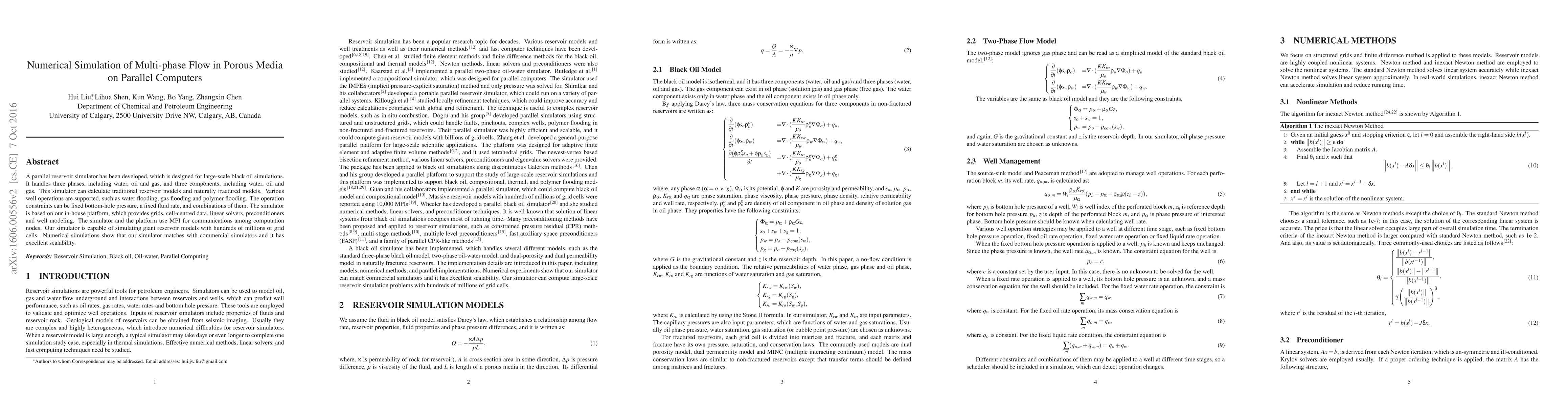 A parallel reservoir simulator has been developed, which is designed for large-scale black oil simulations. It handles three phases, including water, oil and gas, and three components, including water, oil and gas. This simulator can calculate traditional reservoir models and naturally fractured models. Various well operations are supported, such as water flooding, gas flooding and polymer flooding. The operation constraints can be fixed bottom-hole pressure, a fixed fluid rate, and combinations of them. The simulator is based on our in-house platform, which provides grids, cell-centred data, linear solvers, preconditioners and well modeling. The simulator and the platform use MPI for communications among computation nodes. Our simulator is capable of simulating giant reservoir models with hundreds of millions of grid cells. Numerical simulations show that our simulator matches with commercial simulators and it has excellent scalability.