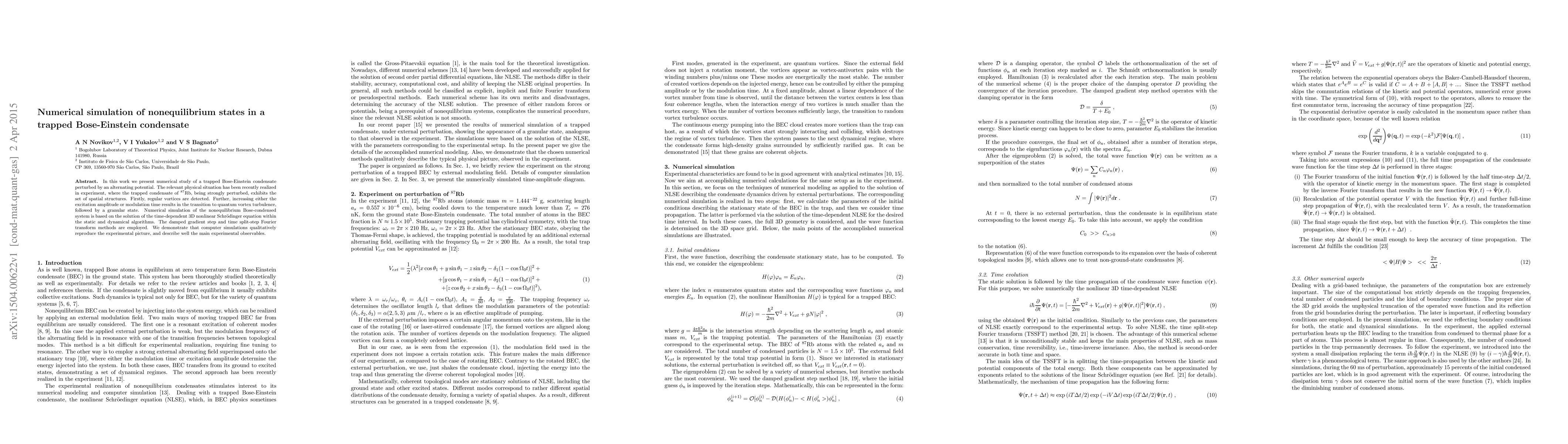 In this work we present numerical study of a trapped Bose-Einstein condensate perturbed by an alternating potential. The relevant physical situation has been recently realized in experiment, where the trapped condensate of $^{87}$Rb, being strongly perturbed, exhibits the set of spatial structures. Firstly, regular vortices are detected. Further, increasing either the excitation amplitude or modulation time results in the transition to quantum vortex turbulence, followed by a granular state. Numerical simulation of the nonequilibrium Bose-condensed system is based on the solution of the time-dependent 3D nonlinear Schr\"{o}dinger equation within the static and dynamical algorithms. The damped gradient step and time split-step Fourier transform methods are employed. We demonstrate that computer simulations qualitatively reproduce the experimental picture, and describe well the main experimental observables.