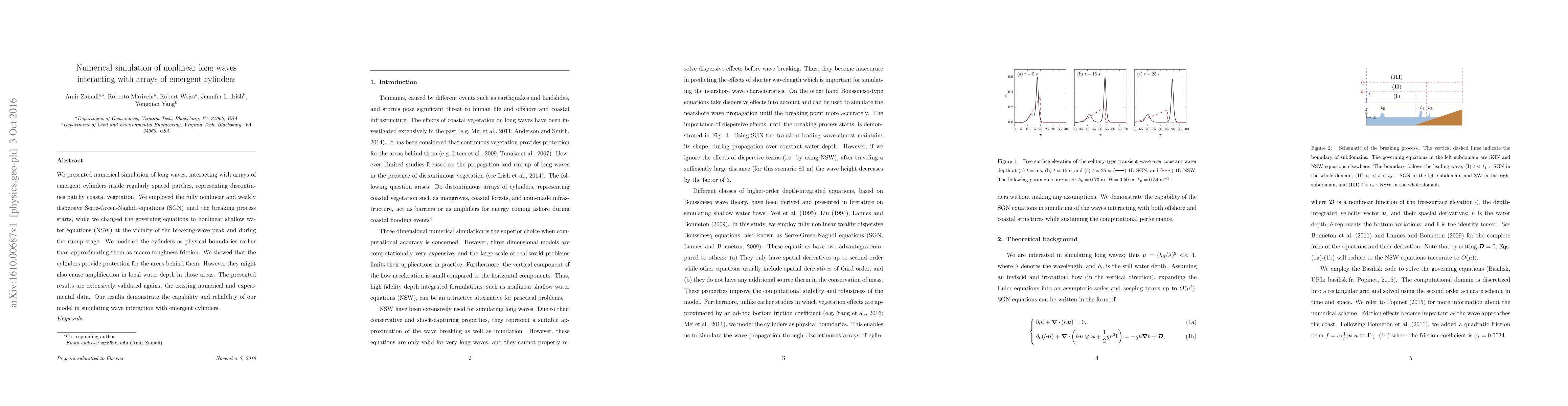 We presented numerical simulation of long waves, interacting with arrays of emergent cylinders inside regularly spaced patches, representing discontinues patchy coastal vegetation. We employed the fully nonlinear and weakly dispersive Serre-Green-Naghdi equations (SGN) until the breaking process starts, while we changed the governing equations to nonlinear shallow water equations (NSW) at the vicinity of the breaking-wave peak and during the runup stage. We modeled the cylinders as physical boundaries rather than approximating them as macro-roughness friction. We showed that the cylinders provide protection for the areas behind them. However they might also cause amplification in local water depth in those areas. The presented results are extensively validated against the existing numerical and experimental data. Our results demonstrate the capability and reliability of our model in simulating wave interaction with emergent cylinders.