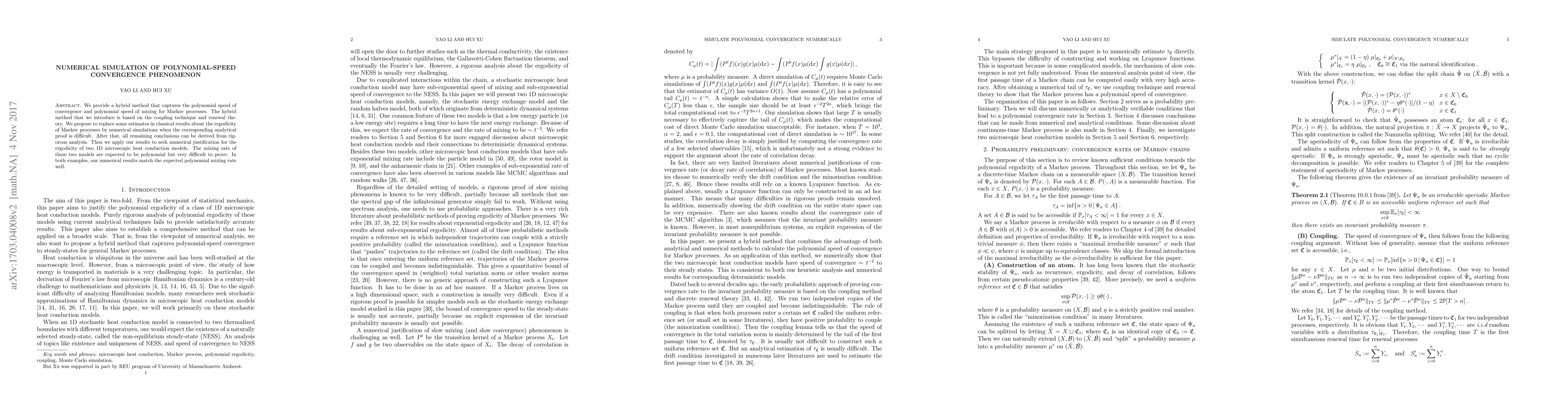 This paper introduces a hybrid method using coupling techniques and renewal theory to simulate polynomial-speed convergence and mixing in Markov processes, replacing difficult analytical proofs with numerical simulations. The method is applied to two 1D heat conduction models, where numerical results confirm the expected polynomial mixing rates.