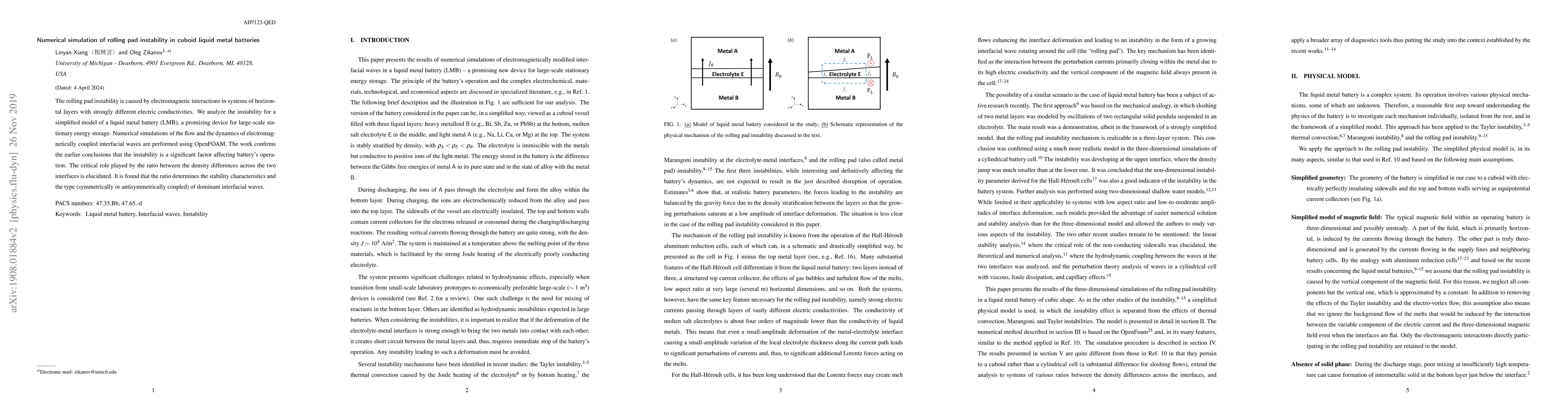 The rolling pad instability is caused by electromagnetic interactions in systems of horizontal layers with strongly different electric conductivities. We analyze the instability for a simplified model of a liquid metal battery (LMB), a promising device for large-scale stationary energy storage. Numerical simulations of the flow and the dynamics of electromagnetically coupled interfacial waves are performed using OpenFOAM. The work confirms the earlier conclusions that the instability is a significant factor affecting battery's operation. The critical role played by the ratio between the density differences across the two interfaces is elucidated. It is found that the ratio determines the stability characteristics and the type (symmetrically or antisymmetrically coupled) of dominant interfacial waves.