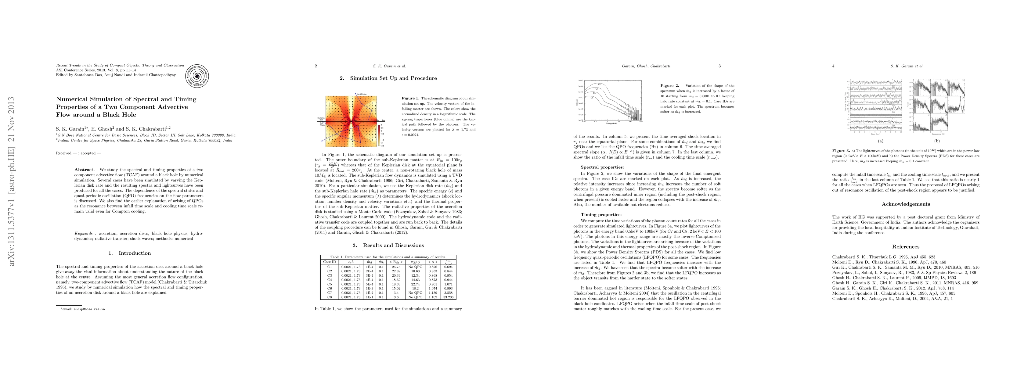 This paper numerically simulates the spectral and timing properties of a two-component advective flow (TCAF) around a black hole, examining the effects of varying Keplerian disk rate on spectra and lightcurves. The study confirms that quasi-periodic oscillations (QPOs) arise from resonance between infall and cooling timescales, even with Compton cooling.