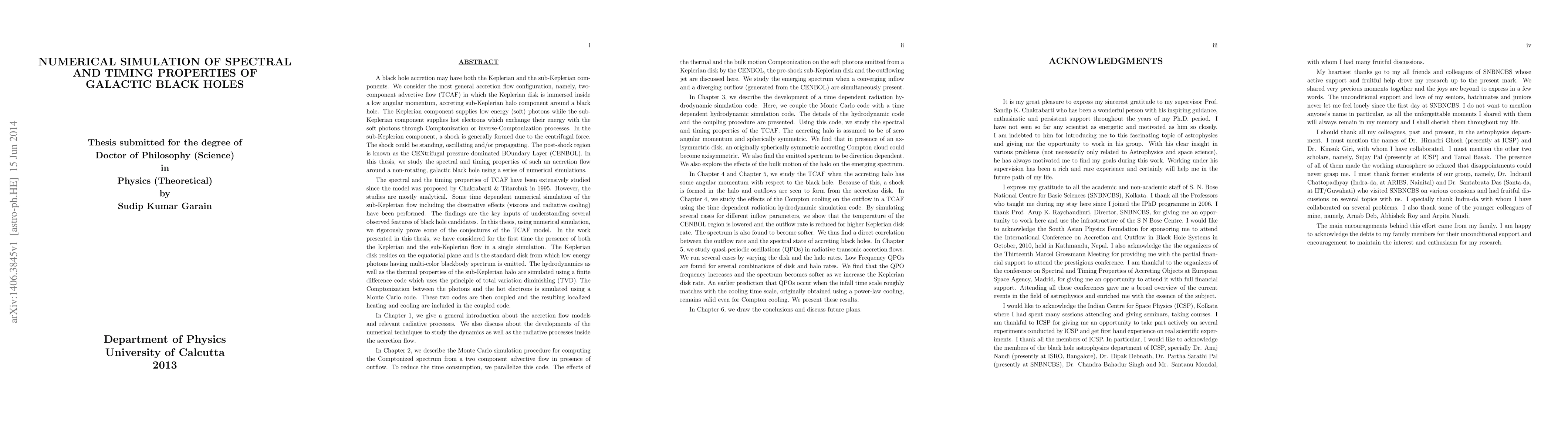 This paper presents numerical simulations of the spectral and timing properties of accretion flows around galactic black holes, specifically focusing on the two-component advective flow (TCAF) model. The study rigorously proves conjectures of the TCAF model, combining Keplerian disk and sub-Keplerian halo simulations to analyze photon-electron interactions and resulting spectral features.