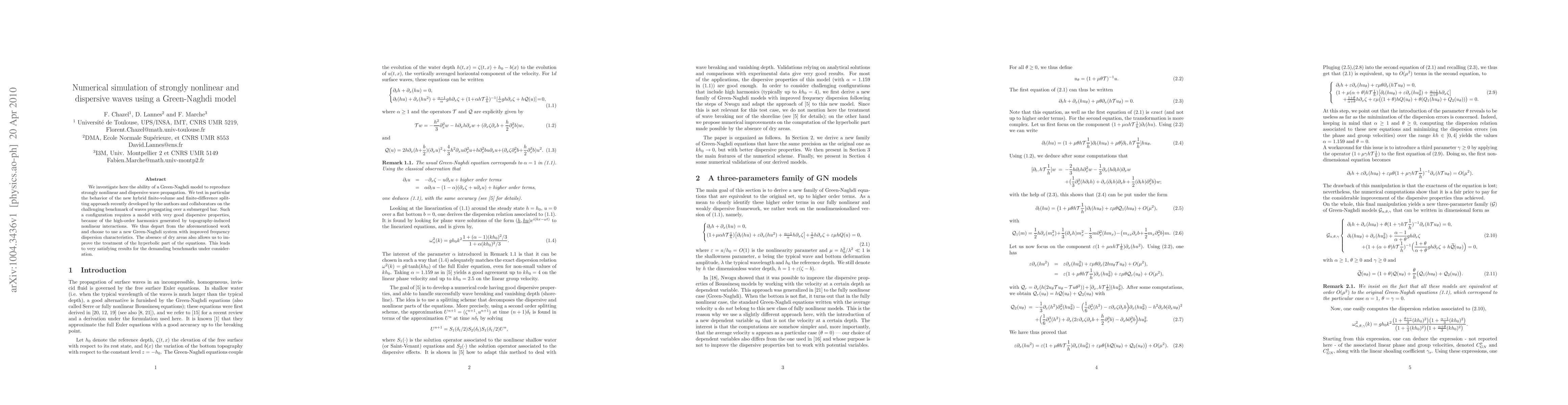 This paper evaluates the Green-Naghdi model's effectiveness in simulating strongly nonlinear and dispersive wave propagation, particularly focusing on a new hybrid finite-volume and finite-difference splitting approach. The model's performance is tested on waves over a submerged bar, demonstrating improved dispersive properties and satisfactory results.