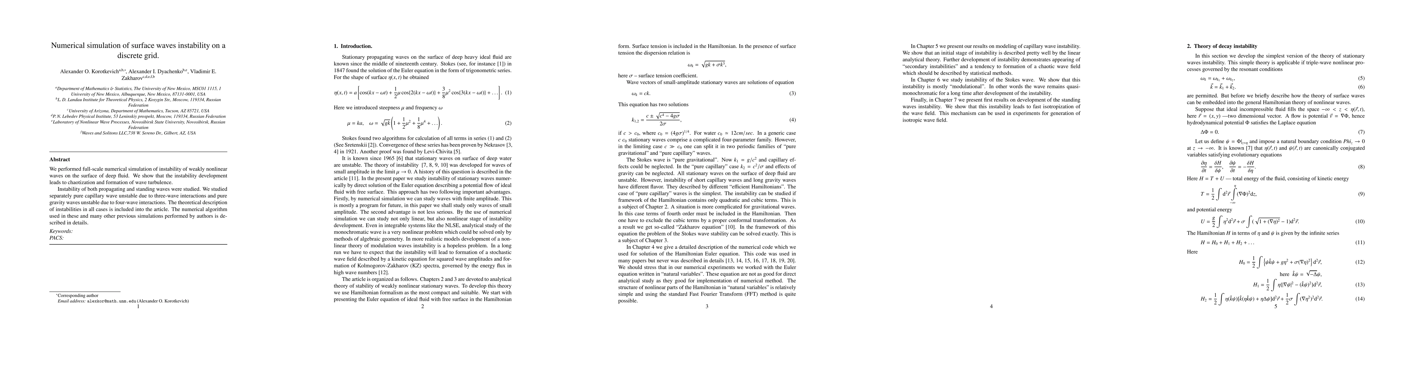 We perform full-scale numerical simulation of instability of weakly nonlinear waves on the surface of deep fluid. We show that the instability development leads to chaotization and formation of wave turbulence. We study instability both of propagating and standing waves. We studied separately pure capillary wave unstable due to three-wave interactions and pure gravity waves unstable due to four-wave interactions. The theoretical description of instabilities in all cases is included into the article. The numerical algorithm used in these and many other previous simulations performed by authors is described in details.