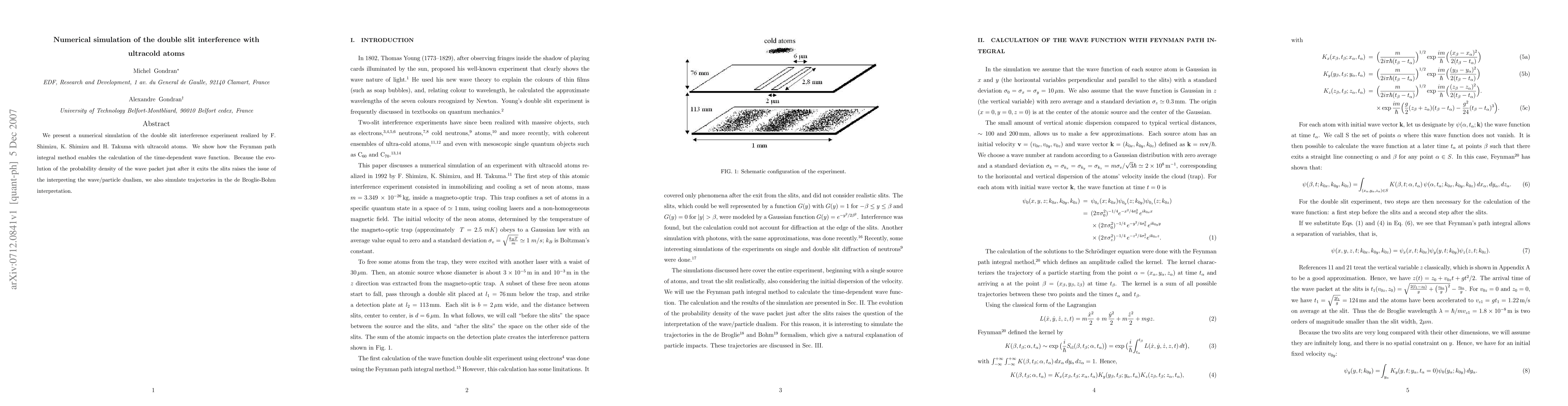 We present a numerical simulation of the double slit interference experiment realized by F. Shimizu, K. Shimizu and H. Takuma with ultracold atoms. We show how the Feynman path integral method enables the calculation of the time-dependent wave function. Because the evolution of the probability density of the wave packet just after it exits the slits raises the issue of the interpreting the wave/particle dualism, we also simulate trajectories in the de Broglie-Bohm interpretation.