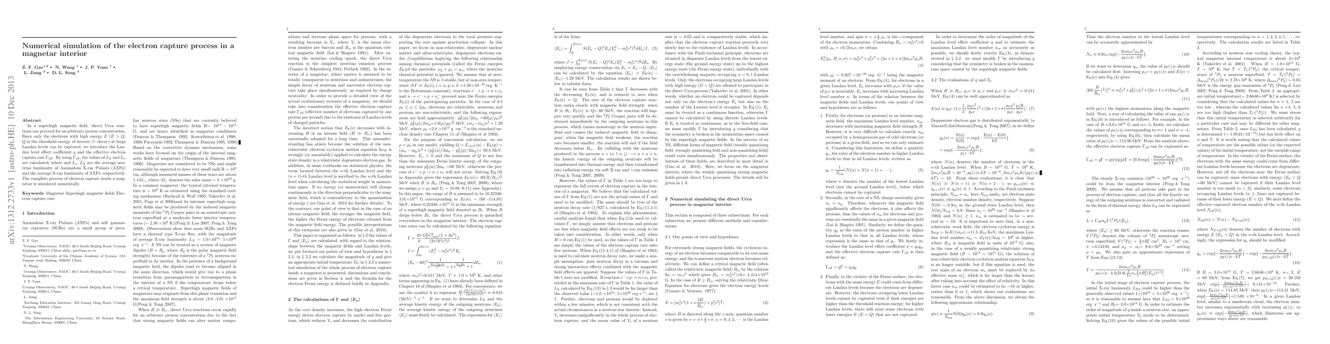 This paper numerically simulates the electron capture process in magnetars' interiors, focusing on the direct Urca reactions under superhigh magnetic fields. It introduces the Landau level effect coefficient and the effective electron capture rate to calculate the average neutrino and X-ray luminosities, providing insights into Anomalous X-ray Pulsars (AXPs).