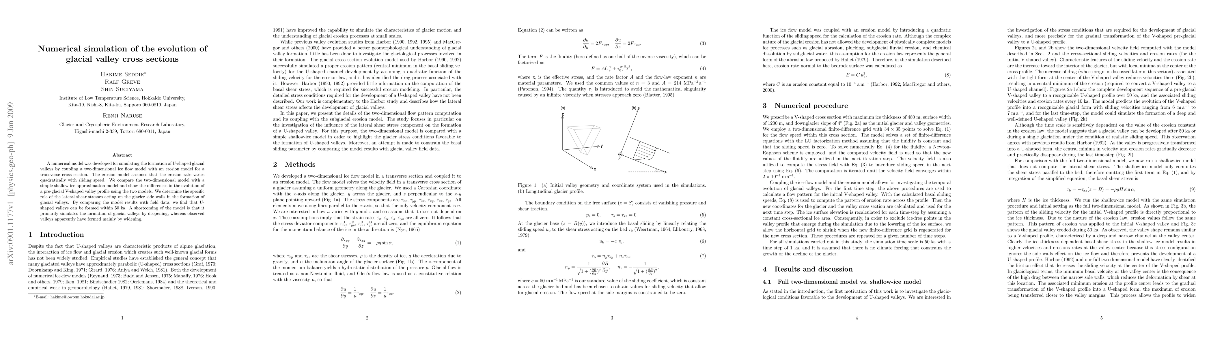 A numerical model was developed for simulating the formation of U-shaped glacial valleys by coupling a two-dimensional ice flow model with an erosion model for a transverse cross section. The erosion model assumes that the erosion rate varies quadratically with sliding speed. We compare the two-dimensional model with a simple shallow-ice approximation model and show the differences in the evolution of a pre-glacial V-shaped valley profile using the two models. We determine the specific role of the lateral shear stresses acting on the glacier side walls in the formation of glacial valleys. By comparing the model results with field data, we find that U-shaped valleys can be formed within 50 ka. A shortcoming of the model is that it primarily simulates the formation of glacial valleys by deepening, whereas observed valleys apparently have formed mainly by widening.