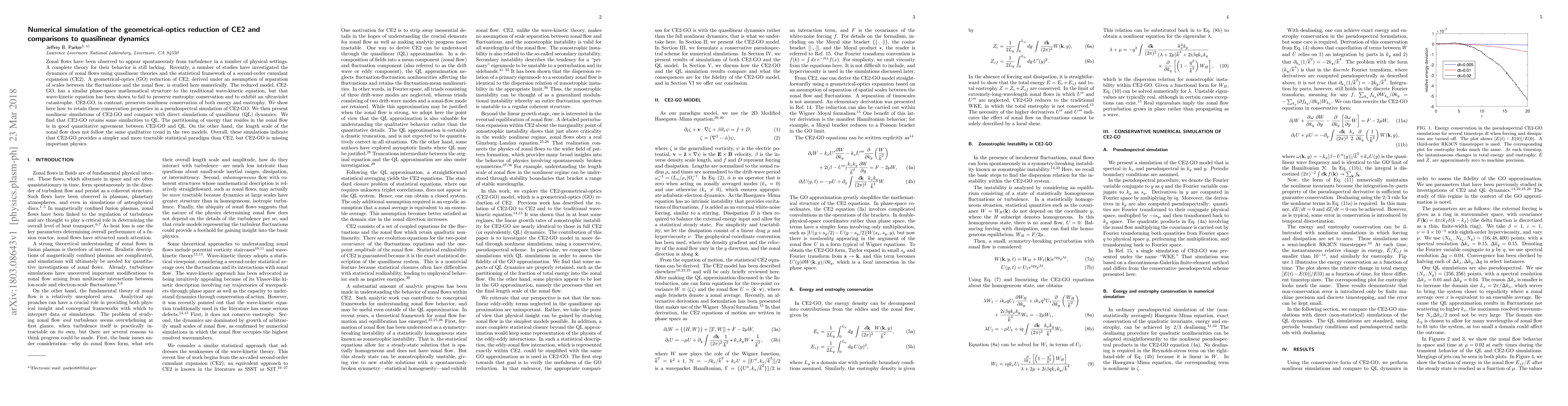 This paper numerically investigates a geometrical-optics reduction of CE2, comparing it to quasilinear dynamics for zonal flow behavior. The study finds that while CE2-GO retains energy partitioning similarities to quasilinear models, it diverges in the length scale of zonal flows, indicating CE2-GO's simpler but less comprehensive nature.