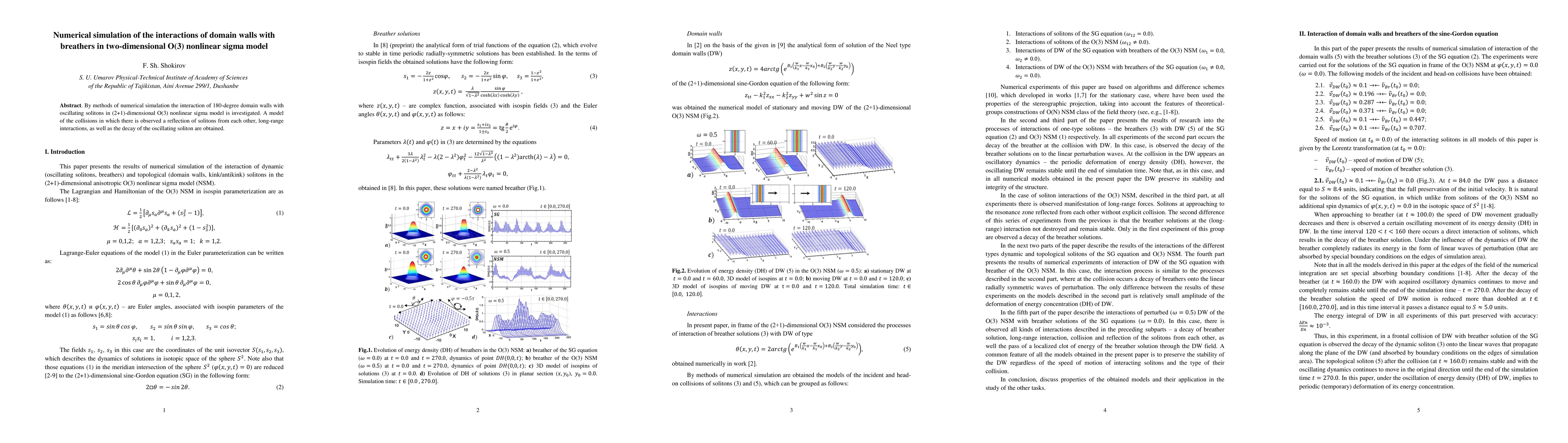 By methods of numerical simulation the interaction of 180-degree domain walls with oscillating solitons in (2+1)-dimensional O(3) nonlinear sigma model is investigated. A model of the collisions in which there is observed a reflection of solitons from each other, long-range interactions, as well as the decay of the oscillating soliton are obtained.