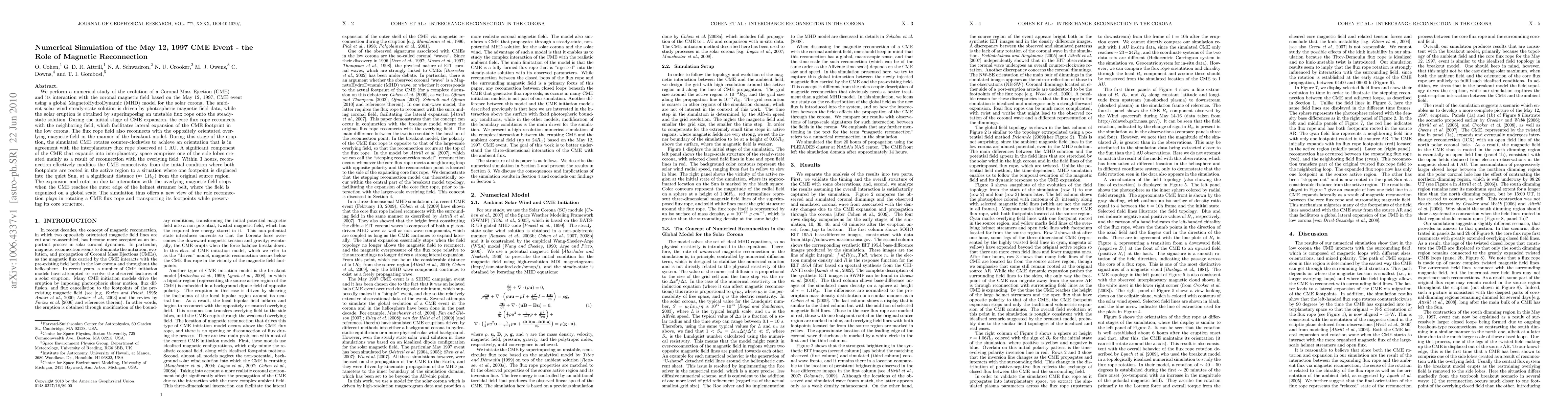 This study uses a numerical model to simulate the May 12, 1997 CME event, finding that magnetic reconnection plays a key role in rotating and transporting the flux rope's footpoints while preserving its core structure.