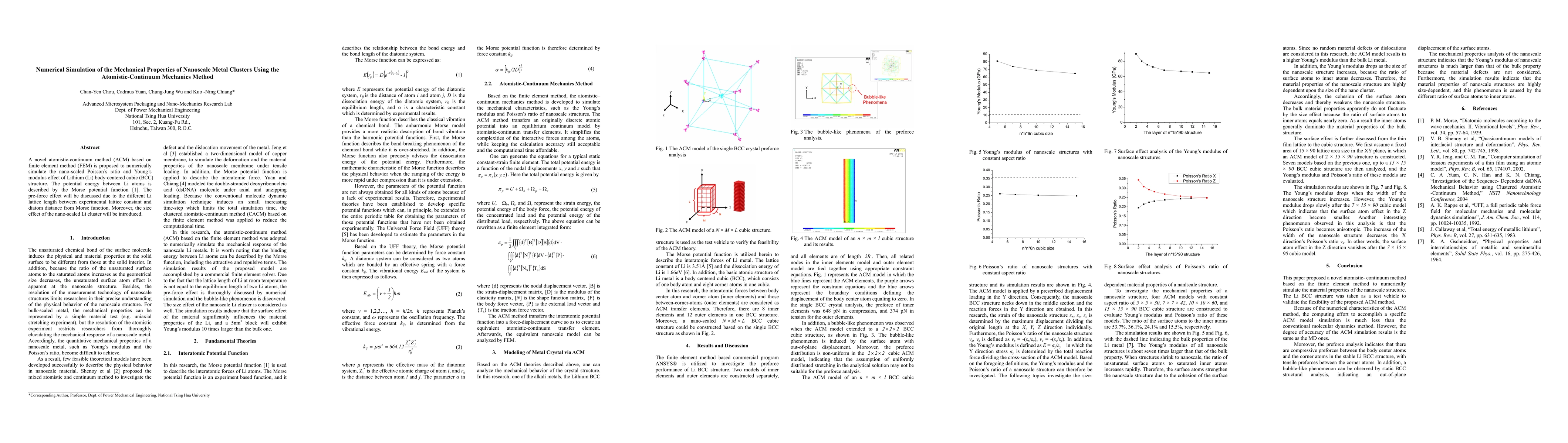 A novel atomistic-continuum method (ACM) based on finite element method (FEM) is proposed to numerically simulate the nano-scaled Poisson's ratio and Young's modulus effect of Lithium (Li) body-centered cubic (BCC) structure. The potential energy between Li atoms is described by the Morse potential function [1]. The pre-force effect will be discussed due to the different Li lattice length between experimental lattice constant and diatom distance from Morse function. Moreover, the size effect of the nano-scaled Li cluster will be introduced.