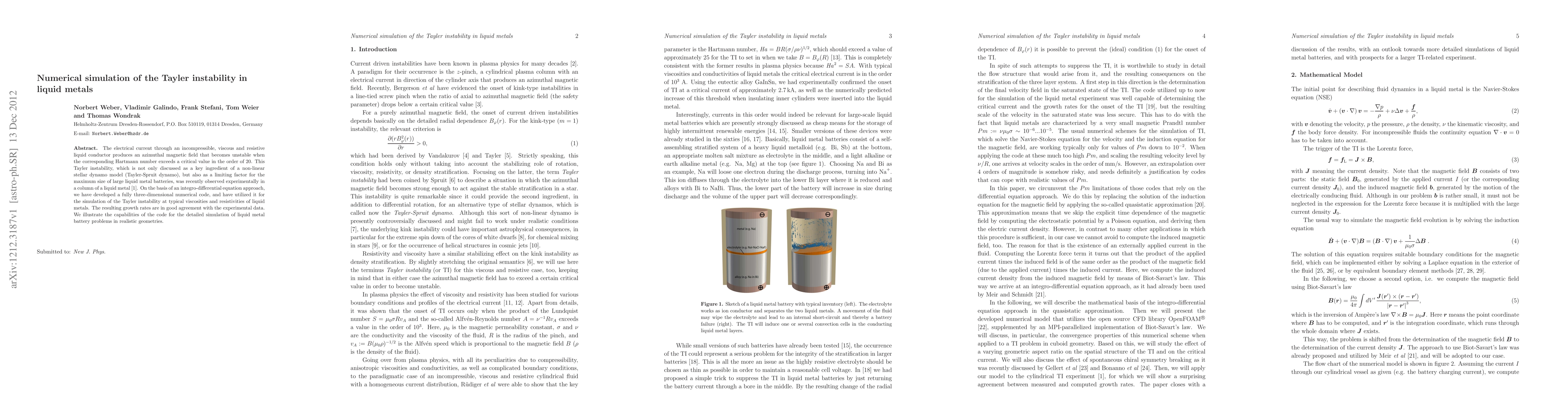 This paper develops a three-dimensional numerical code to simulate the Tayler instability in liquid metals, showing good agreement with experimental data and demonstrating its application to liquid metal battery problems. The Tayler instability, a critical factor in stellar dynamo models and battery size limits, is analyzed through an integro-differential equation approach.