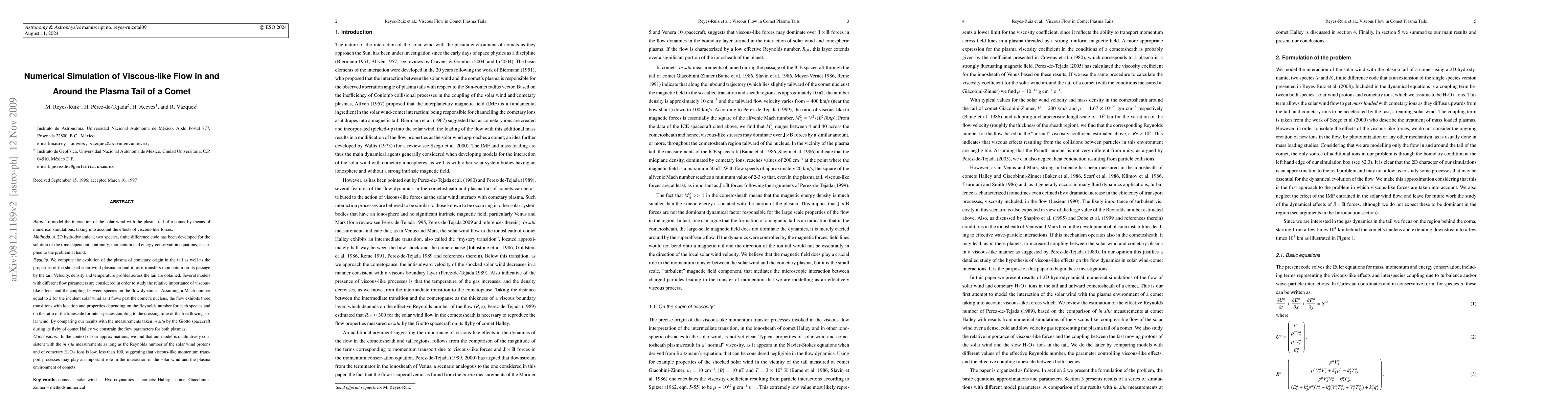 This paper presents numerical simulations of the solar wind's interaction with a comet's plasma tail, focusing on viscous-like forces. The study uses a 2D hydrodynamical code to model the flow dynamics, revealing three flow transitions dependent on Reynolds number and inter-species coupling ratios. The model aligns qualitatively with Giotto spacecraft measurements, suggesting viscous-like momentum transport is significant when the Reynolds number is low.