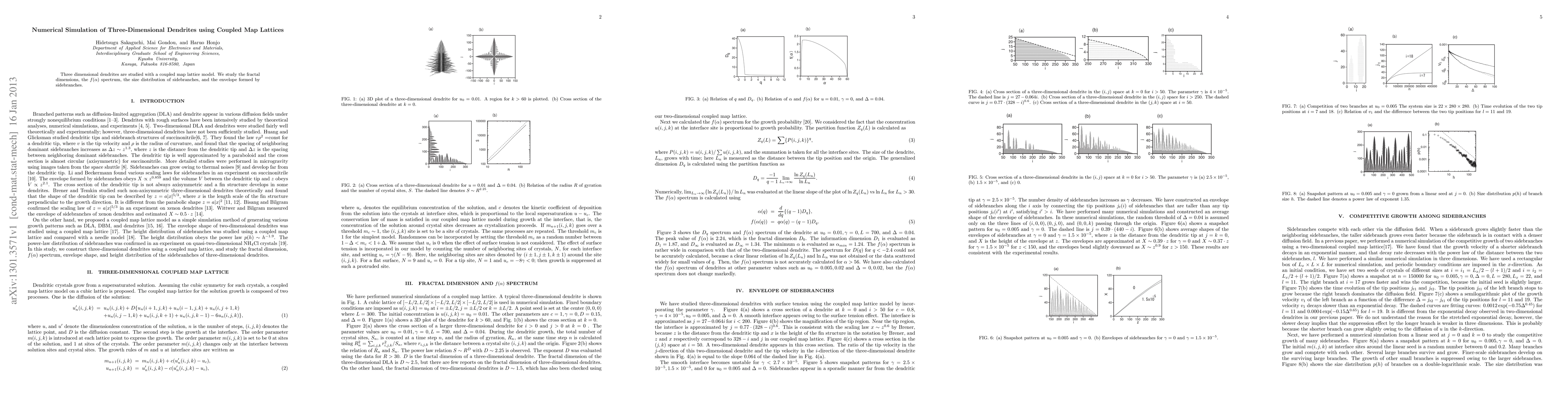 Three dimensional dendrites are studied with a coupled map lattice model. We study the fractal dimensions, the f(\alpha) spectrum, the size distribution of sidebranches, and the envelope formed by sidebranches.