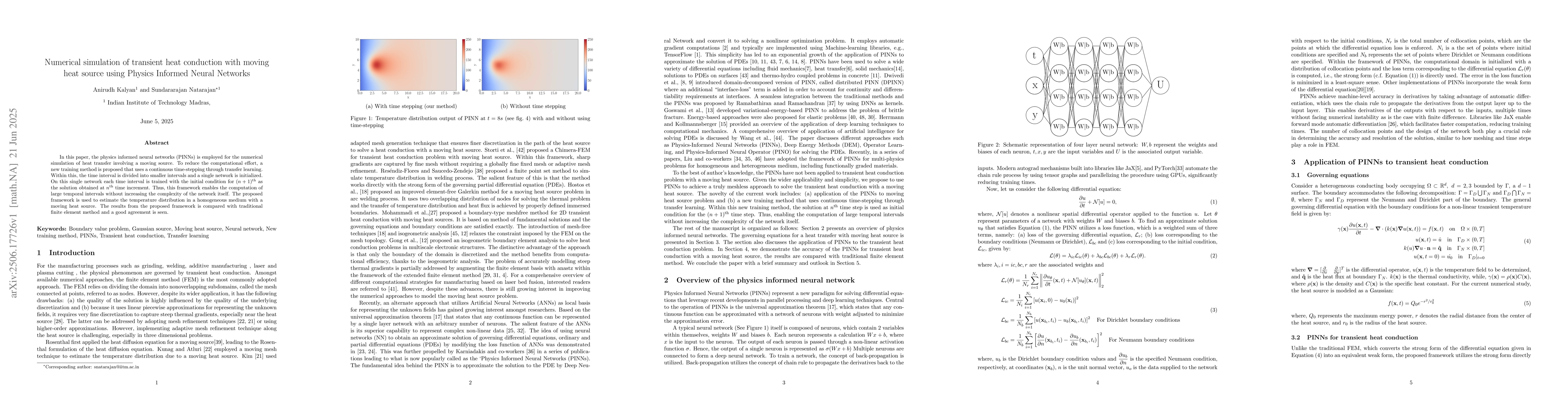 In this paper, the physics informed neural networks (PINNs) is employed for the numerical simulation of heat transfer involving a moving source. To reduce the computational effort, a new training method is proposed that uses a continuous time-stepping through transfer learning. Within this, the time interval is divided into smaller intervals and a single network is initialized. On this single network each time interval is trained with the initial condition for (n+1)th as the solution obtained at nth time increment. Thus, this framework enables the computation of large temporal intervals without increasing the complexity of the network itself. The proposed framework is used to estimate the temperature distribution in a homogeneous medium with a moving heat source. The results from the proposed framework is compared with traditional finite element method and a good agreement is seen.