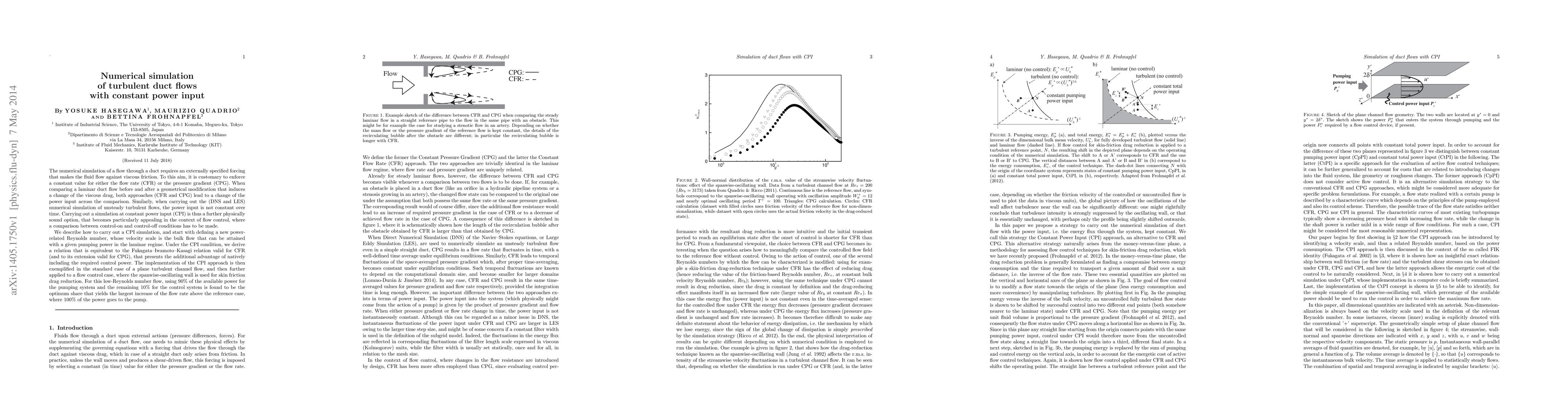 The numerical simulation of a flow through a duct requires an externally specified forcing that makes the fluid flow against viscous friction. To this aim, it is customary to enforce a constant value for either the flow rate (CFR) or the pressure gradient (CPG). When comparing a laminar duct flow before and after a geometrical modification that induces a change of the viscous drag, both approaches (CFR and CPG) lead to a change of the power input across the comparison. Similarly, when carrying out the (DNS and LES) numerical simulation of unsteady turbulent flows, the power input is not constant over time. Carrying out a simulation at constant power input (CPI) is thus a further physically sound option, that becomes particularly appealing in the context of flow control, where a comparison between control-on and control-off conditions has to be made. We describe how to carry out a CPI simulation, and start with defining a new power-related Reynolds number, whose velocity scale is the bulk flow that can be attained with a given pumping power in the laminar regime. Under the CPI condition, we derive a relation that is equivalent to the Fukagata--Iwamoto--Kasagi relation valid for CFR (and to its extension valid for CPG), that presents the additional advantage of natively including the required control power. The implementation of the CPI approach is then exemplified in the standard case of a plane turbulent channel flow, and then further applied to a flow control case, where the spanwise-oscillating wall is used for skin friction drag reduction. For this low-Reynolds number flow, using 90% of the available power for the pumping system and the remaining 10% for the control system is found to be the optimum share that yields the largest increase of the flow rate above the reference case, where 100% of the power goes to the pump.
