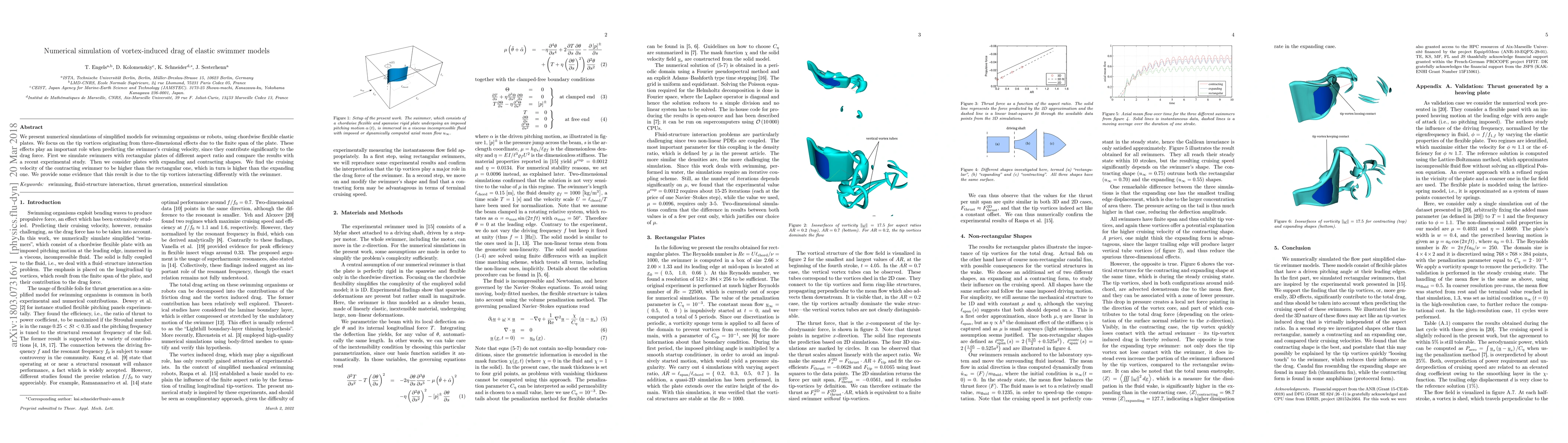 We present numerical simulations of simplified models for swimming organisms or robots, using chordwise flexible elastic plates. We focus on the tip vortices originating from three-dimensional effects due to the finite span of the plate. These effects play an important role when predicting the swimmer's cruising velocity, since they contribute significantly to the drag force. First we simulate swimmers with rectangular plates of different aspect ratio and compare the results with a recent experimental study. Then we consider plates with expanding and contracting shapes. We find the cruising velocity of the contracting swimmer to be higher than the rectangular one, which in turn is higher than the expanding one. We provide some evidence that this result is due to the tip vortices interacting differently with the swimmer.