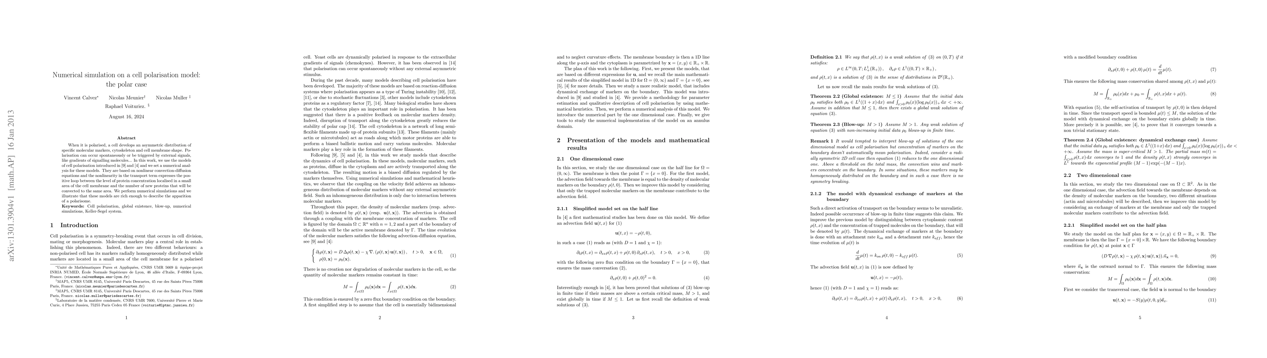 When it is polarised, a cell develops an asymmetric distribution of specific molecular markers, cytoskeleton and cell membrane shape. Polarisation can occur spontaneously or be triggered by external signals, like gradients of signalling molecules... In this work, we use the published models of cell polarisation and we set a numerical analysis for these models. They are based on nonlinear convection-diffusion equations and the nonlinearity in the transport term expresses the positive loop between the level of protein concentration localised in a small area of the cell membrane and the number of new proteins that will be convected to the same area. We perform numerical simulations and we illustrate that these models are rich enough to describe the apparition of a polarisome.