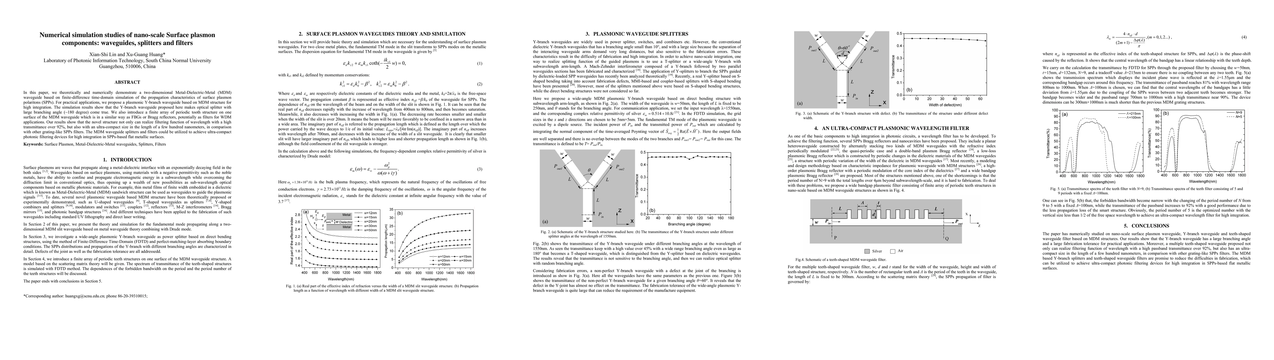 This paper presents numerical simulations of Metal-Dielectric-Metal (MDM) waveguides for surface plasmon polaritons, proposing a Y-branch waveguide for optical splitting and a periodic tooth structure for ultra-compact wavelength filtering in WDM applications. The results demonstrate high integration potential and efficient performance.