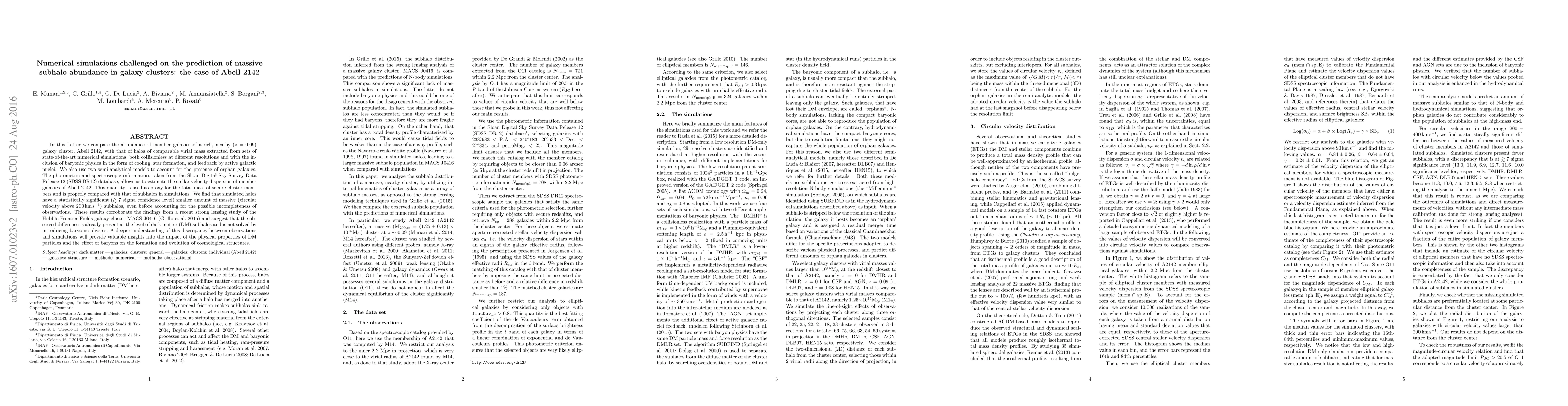 In this Letter we compare the abundance of member galaxies of a rich, nearby ($z=0.09$) galaxy cluster, Abell 2142, with that of halos of comparable virial mass extracted from sets of state-of-the-art numerical simulations, both collisionless at different resolutions and with the inclusion of baryonic physics in the form of cooling, star formation, and feedback by active galactic nuclei. We also use two semi-analytical models to account for the presence of orphan galaxies. The photometric and spectroscopic information, taken from the Sloan Digital Sky Survey Data Release 12 (SDSS DR12) database, allows us to estimate the stellar velocity dispersion of member galaxies of Abell 2142. This quantity is used as proxy for the total mass of secure cluster members and is properly compared with that of subhalos in simulations. We find that simulated halos have a statistically significant ($\gtrsim 7$ sigma confidence level) smaller amount of massive (circular velocity above $200\,{\rm km\, s^{-1}}$) subhalos, even before accounting for the possible incompleteness of observations. These results corroborate the findings from a recent strong lensing study of the Hubble Frontier Fields galaxy cluster MACS J0416 \citep{grillo2015} and suggest that the observed difference is already present at the level of dark matter (DM) subhalos and is not solved by introducing baryonic physics. A deeper understanding of this discrepancy between observations and simulations will provide valuable insights into the impact of the physical properties of DM particles and the effect of baryons on the formation and evolution of cosmological structures.