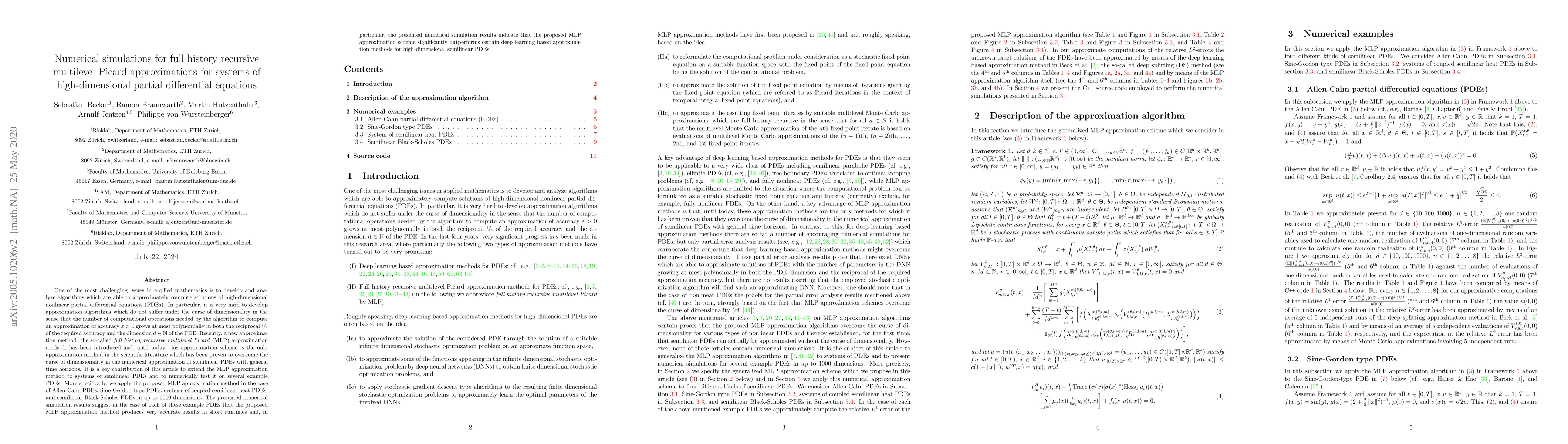 This paper introduces a full history recursive multilevel Picard approximation method for solving high-dimensional semilinear partial differential equations, demonstrating its effectiveness through numerical simulations on several example PDEs, including Allen-Cahn, Sine-Gordon-type, coupled semilinear heat, and semilinear Black-Scholes PDEs, showing significant performance improvements over deep learning methods.