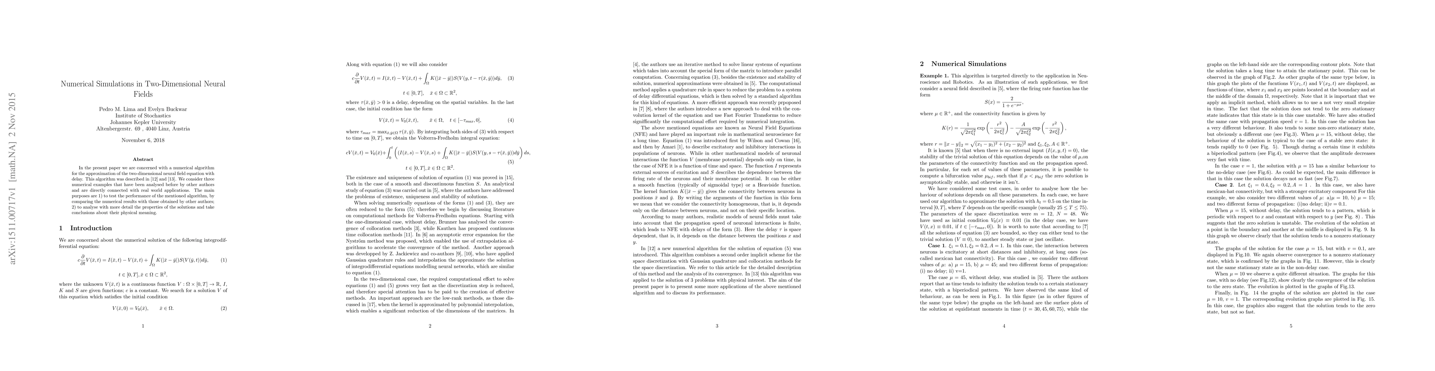 In the present paper we are concerned with a numerical algorithm for the approximation of the two-dimensional neural field equation with delay. We consider three numerical examples that have been analysed before by other authors and are directly connected with real world applications. The main purposes are 1) to test the performance of the mentioned algorithm, by comparing the numerical results with those obtained by other authors; 2) to analyse with more detail the properties of the solutions and take conclusions about their physical meaning.