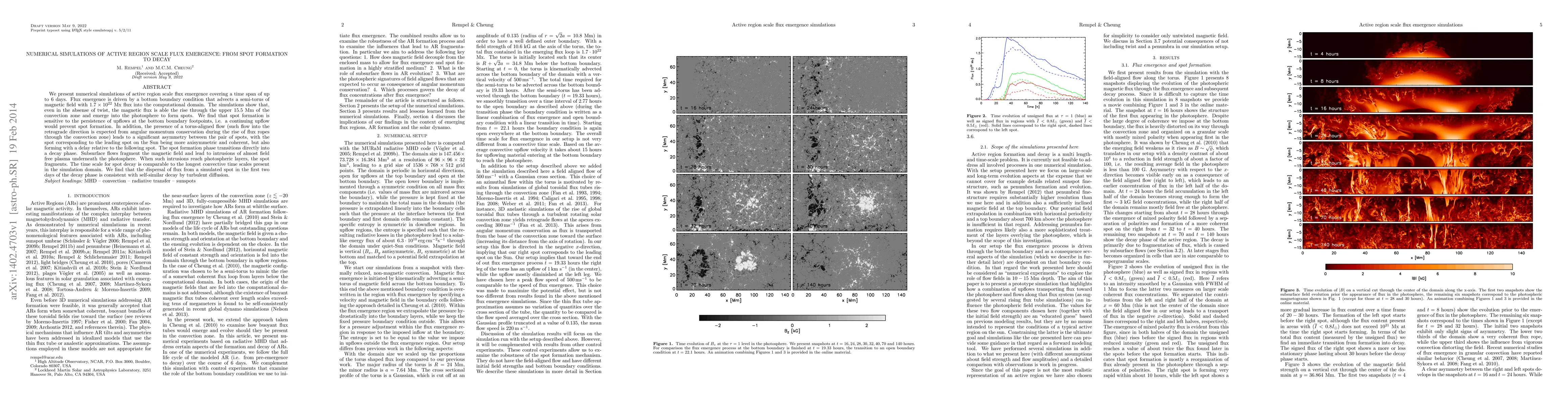 This paper presents numerical simulations of active region scale flux emergence, detailing the formation and decay of sunspots over 6 days. The simulations show that magnetic flux can rise through the convection zone to form spots, with spot formation dependent on persistent upflows and influenced by torus-aligned flows, leading to asymmetrical spot pairs. The decay phase is driven by subsurface flows that fragment the magnetic field, causing spot disintegration in a self-similar decay process.