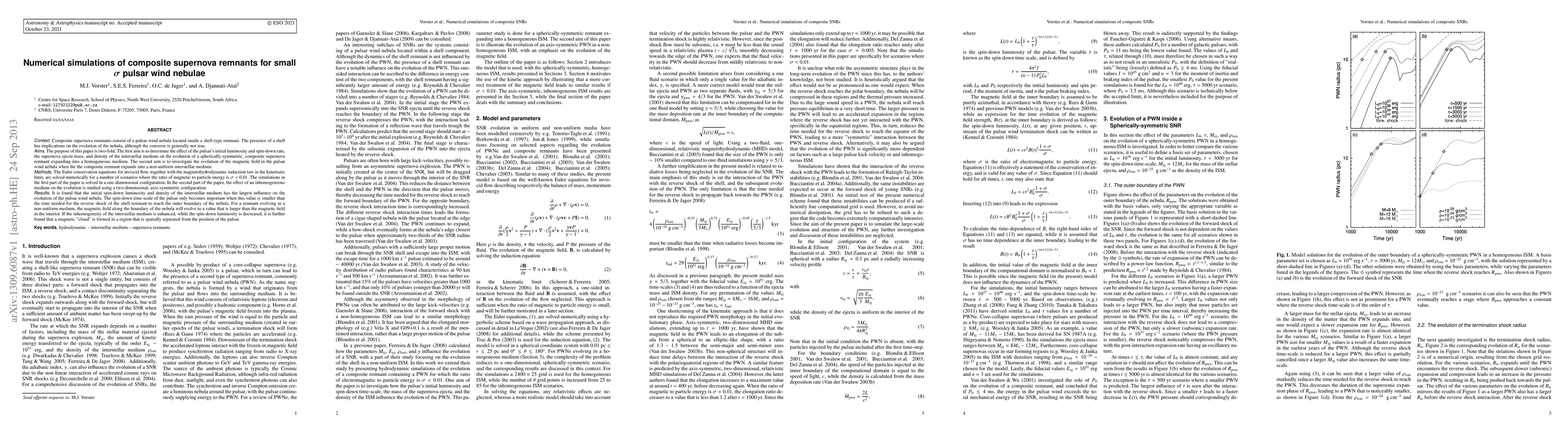 This paper numerically simulates the evolution of composite supernova remnants containing pulsar wind nebulae, focusing on scenarios with small $\sigma$ values. The study examines the impact of initial pulsar luminosity, spin-down rate, and interstellar medium density on the remnant's evolution, and investigates the magnetic field's development in a non-uniform medium.