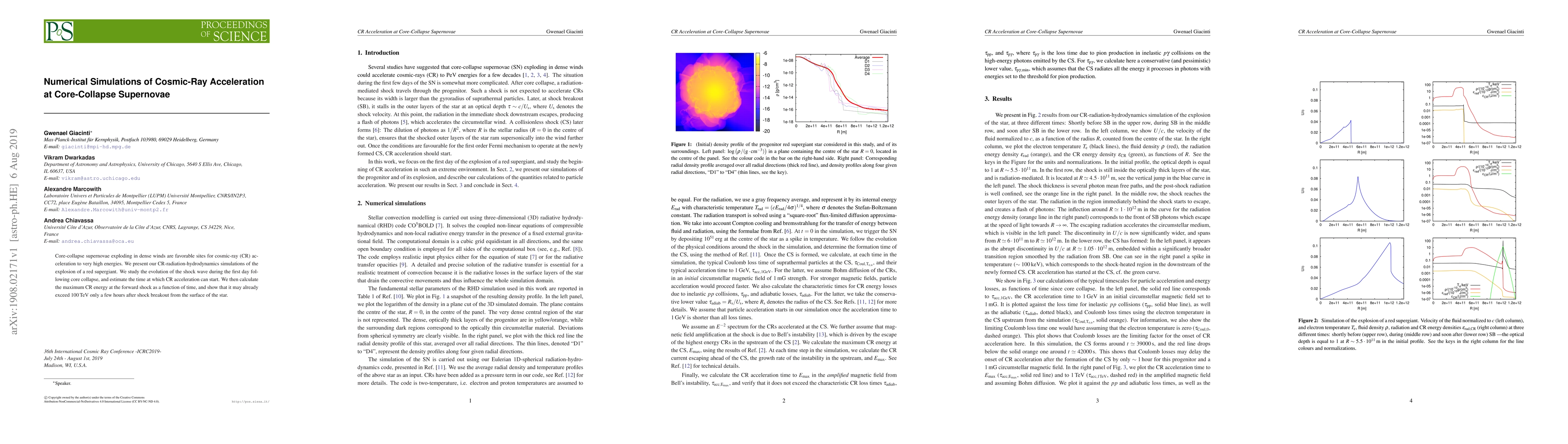 A study simulates cosmic-ray acceleration at core-collapse supernovae, finding that high-energy particles may already exceed 100 TeV just hours after the shock wave breaks through the star's surface.