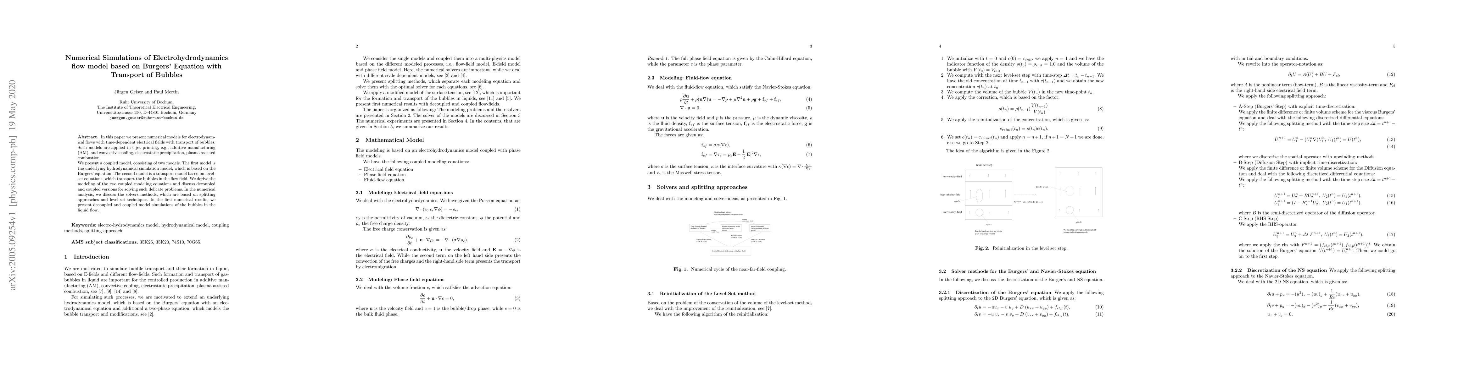 In this paper we present numerical models for electrodynamical flows with time-dependent electrical fields with transport of bubbles. Such models are applied in e-jet printing, e.g., additive manufacturing (AM), and convective cooling, electrostatic precipitation, plasma assisted combustion. We present a coupled model, consisting of two models. The first model is the underlying hydrodynamical simulation model, which is based on the Burgers' equation. The second model is a transport model based on level-set equations, which transport the bubbles in the flow field. We derive the modeling of the two coupled modeling equations and discuss decoupled and coupled versions for solving such delicate problems. In the numerical analysis, we discuss the solvers methods, which are based on splitting approaches and level-set techniques. In the first numerical results, we present decoupled and coupled model simulations of the bubbles in the liquid flow.