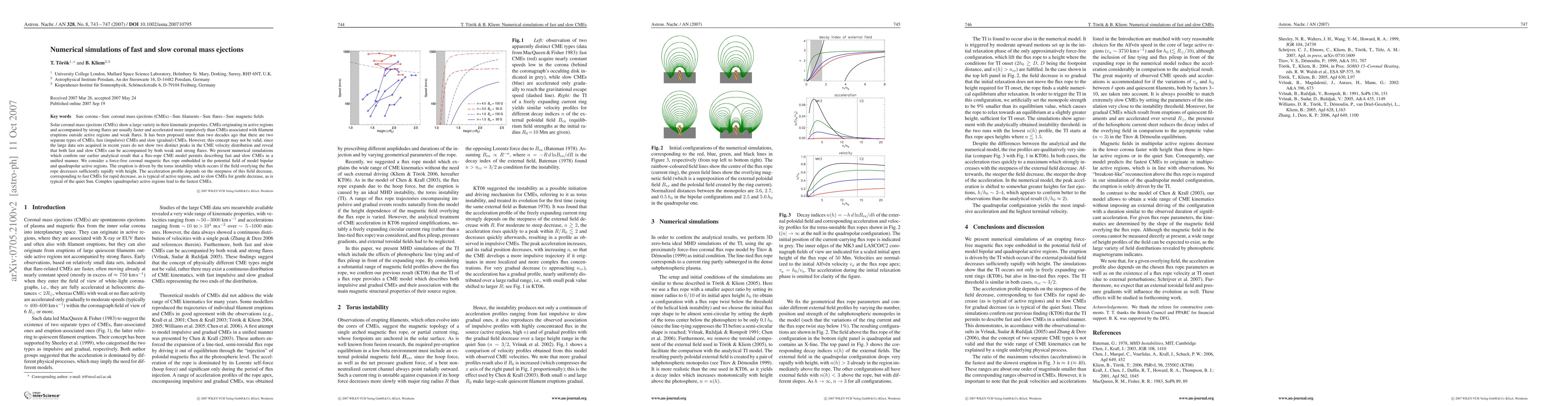 This paper presents numerical simulations showing that fast and slow coronal mass ejections (CMEs) can be described within a unified flux-rope model. The simulations reveal that the acceleration profile of CMEs depends on the rate at which the magnetic field decreases with height, leading to faster CMEs in active regions and slower ones in quiet Sun regions.