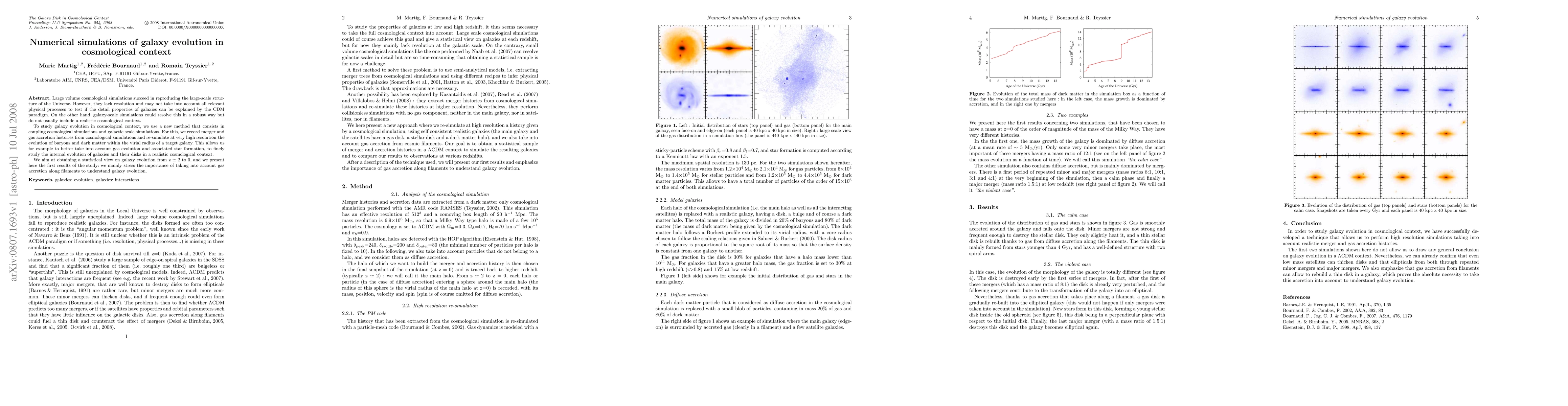 Large volume cosmological simulations succeed in reproducing the large-scale structure of the Universe. However, they lack resolution and may not take into account all relevant physical processes to test if the detail properties of galaxies can be explained by the CDM paradigm. On the other hand, galaxy-scale simulations could resolve this in a robust way but do not usually include a realistic cosmological context. To study galaxy evolution in cosmological context, we use a new method that consists in coupling cosmological simulations and galactic scale simulations. For this, we record merger and gas accretion histories from cosmological simulations and re-simulate at very high resolution the evolution of baryons and dark matter within the virial radius of a target galaxy. This allows us for example to better take into account gas evolution and associated star formation, to finely study the internal evolution of galaxies and their disks in a realistic cosmological context. We aim at obtaining a statistical view on galaxy evolution from z = 2 to 0, and we present here the first results of the study: we mainly stress the importance of taking into account gas accretion along filaments to understand galaxy evolution.