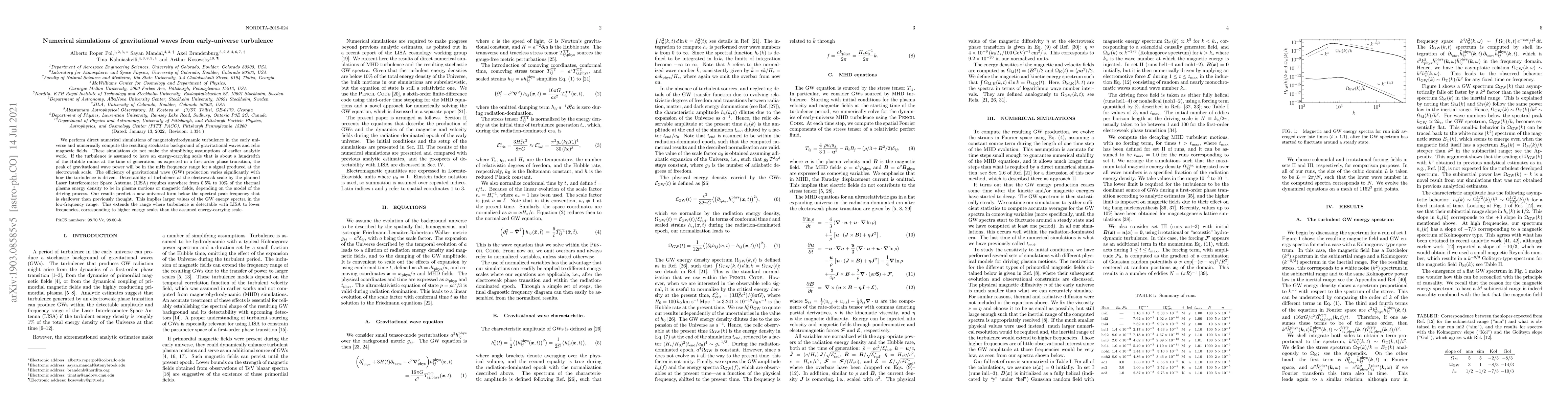 This paper presents numerical simulations of early-universe magnetohydrodynamic turbulence, predicting a stochastic background of gravitational waves and relic magnetic fields. The simulations suggest that turbulence at the electroweak scale could be detectable by LISA, with gravitational wave power peaking in the mHz range, and predict a shallower universal form for the GW energy spectrum, extending detectability to lower frequencies.