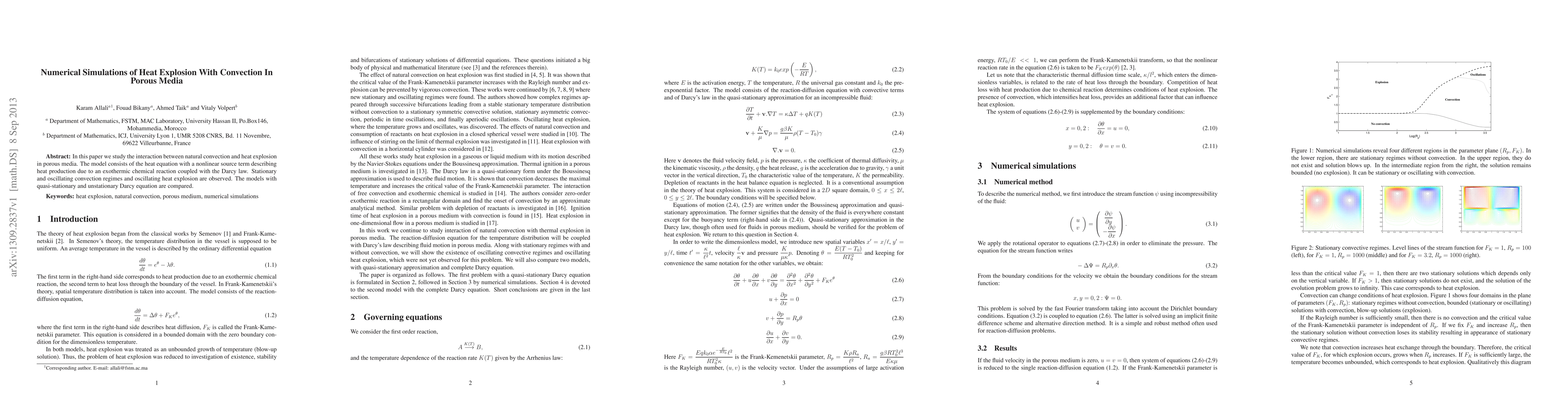This paper investigates the interplay between natural convection and heat explosion in porous media using a model combining the heat equation with a nonlinear source term and Darcy's law. It examines stationary and oscillating convection regimes, and compares quasi-stationary and unstationary Darcy equation models.