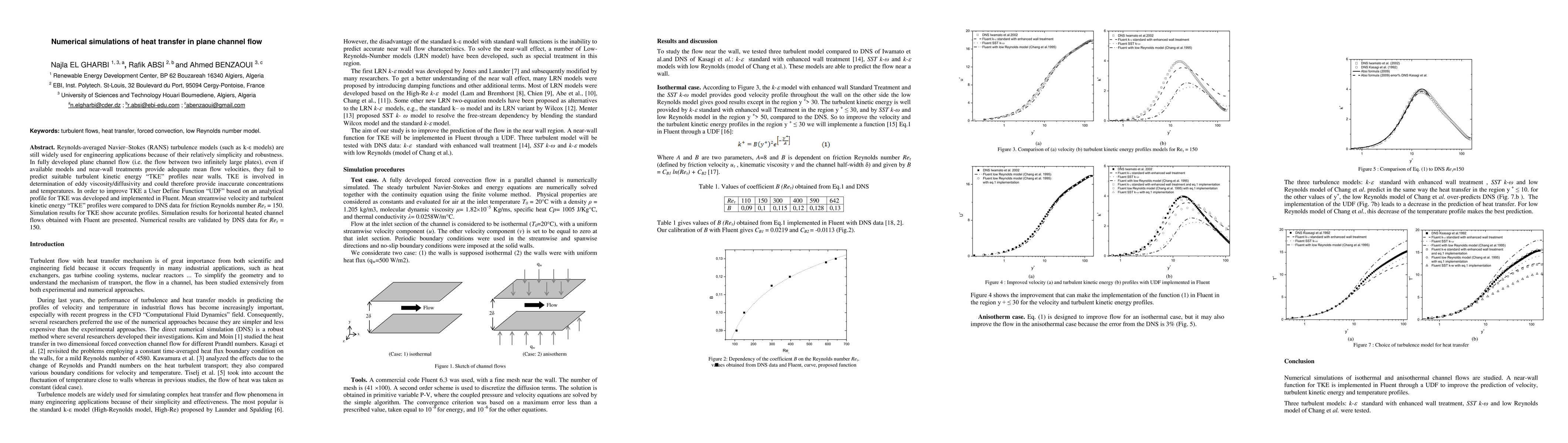 Numerical simulations of fully developed forced convection flow in a parallel channel using Fluent 6.3, with a fine mesh near the wall and second-order scheme for diffusion terms. Three turbulent models tested: k-ε standard with enhanced wall treatment, SST k-ω, and low Reynolds (Chang et al.) k-ε model.