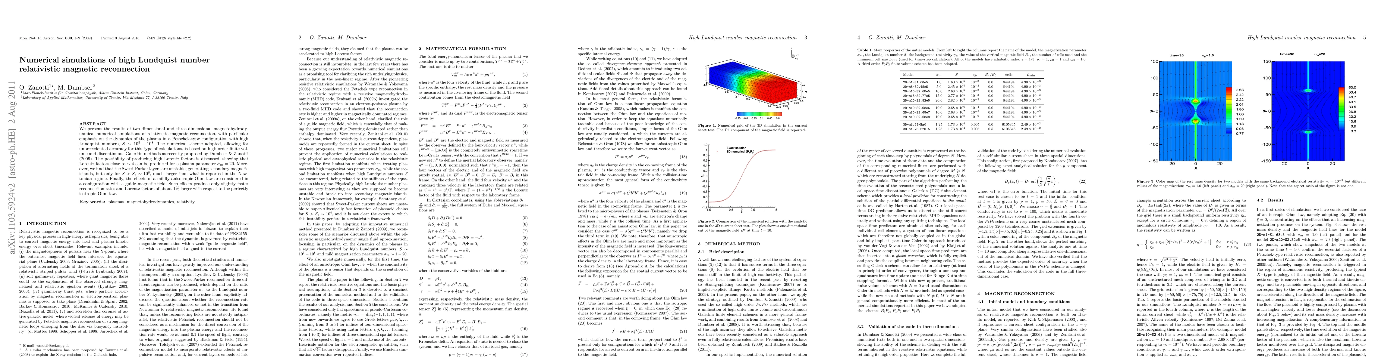 We present the results of two-dimensional and three-dimensional magnetohydrodynamical numerical simulations of relativistic magnetic reconnection, with particular emphasis on the dynamics of the plasma in a Petschek-type configuration with high Lundquist numbers, S\sim 10^5-10^8. The numerical scheme adopted, allowing for unprecedented accuracy for this type of calculations, is based on high order finite volume and discontinuous Galerkin methods as recently proposed by \citet{Dumbser2009}. The possibility of producing high Lorentz factors is discussed, showing that Lorentz factors close to \sim 4 can be produced for a plasma parameter \sigma_m=20. Moreover, we find that the Sweet-Parker layers are unstable, generating secondary magnetic islands, but only for S > S_c = 10^8, much larger than what is reported in the Newtonian regime. Finally, the effects of a mildly anisotropic Ohm law are considered in a configuration with a guide magnetic field. Such effects produce only slightly faster reconnection rates and Lorentz factors of about 1% larger with respect to the perfectly isotropic Ohm law.