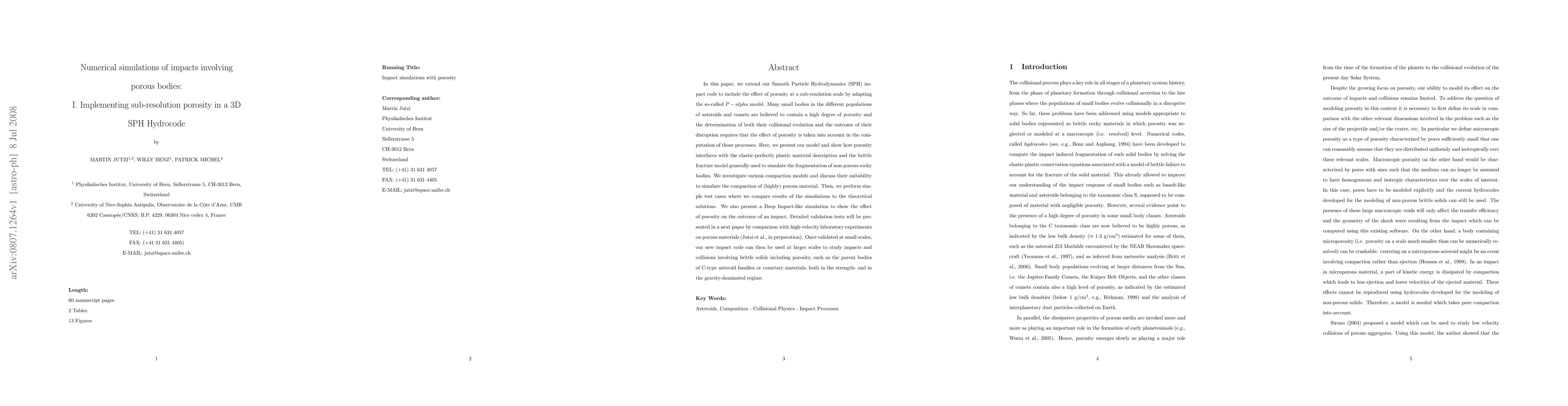 This paper introduces a 3D SPH hydrocode that incorporates sub-resolution porosity using the $P-alpha$ model to simulate impacts involving porous bodies, such as asteroids and comets. The study compares simulation results with theoretical solutions and demonstrates the impact of porosity on collision outcomes, with future validation against laboratory experiments planned.