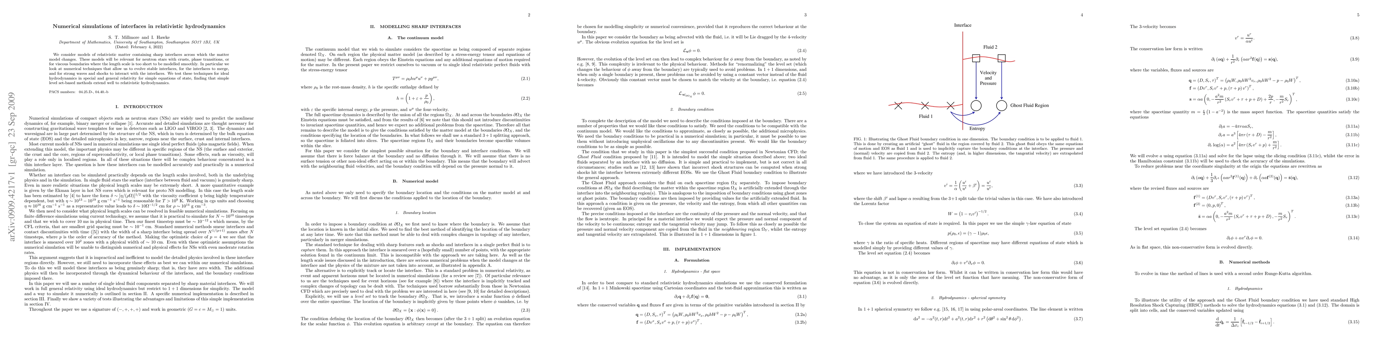 This paper explores numerical simulations for relativistic hydrodynamics involving sharp interfaces, focusing on models of neutron stars and phase transitions. It develops techniques for evolving stable interfaces, merging, and shock interactions, demonstrating that level set methods effectively extend to relativistic scenarios.