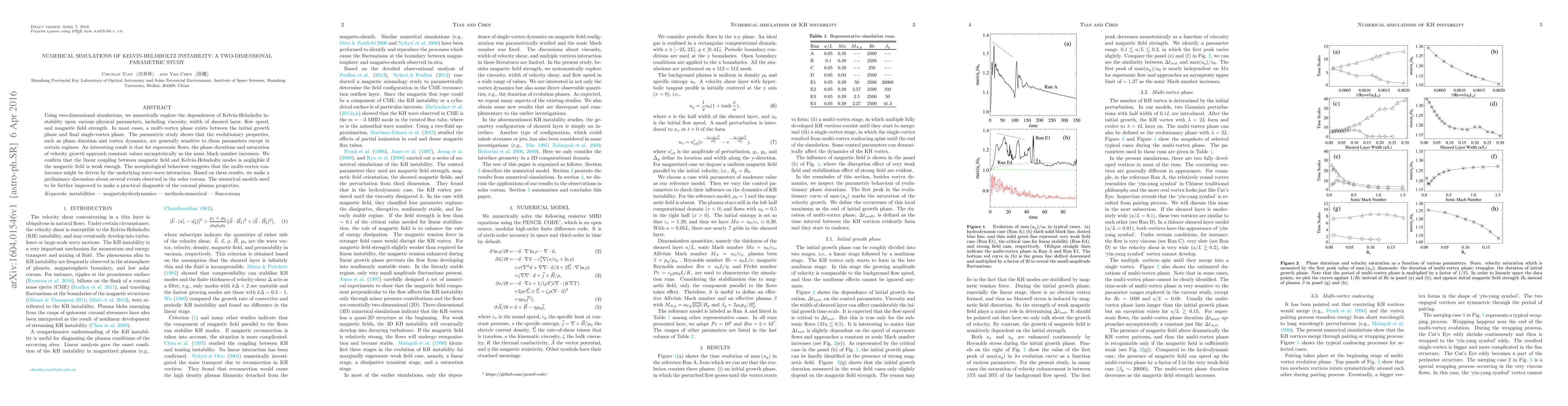 This paper conducts a two-dimensional numerical study of Kelvin-Helmholtz instability, examining its dependence on parameters like viscosity, sheared layer width, flow speed, and magnetic field strength. The study finds that multi-vortex phases are common, and evolutionary properties are sensitive to these parameters, except in specific supersonic regimes where phase durations stabilize.
