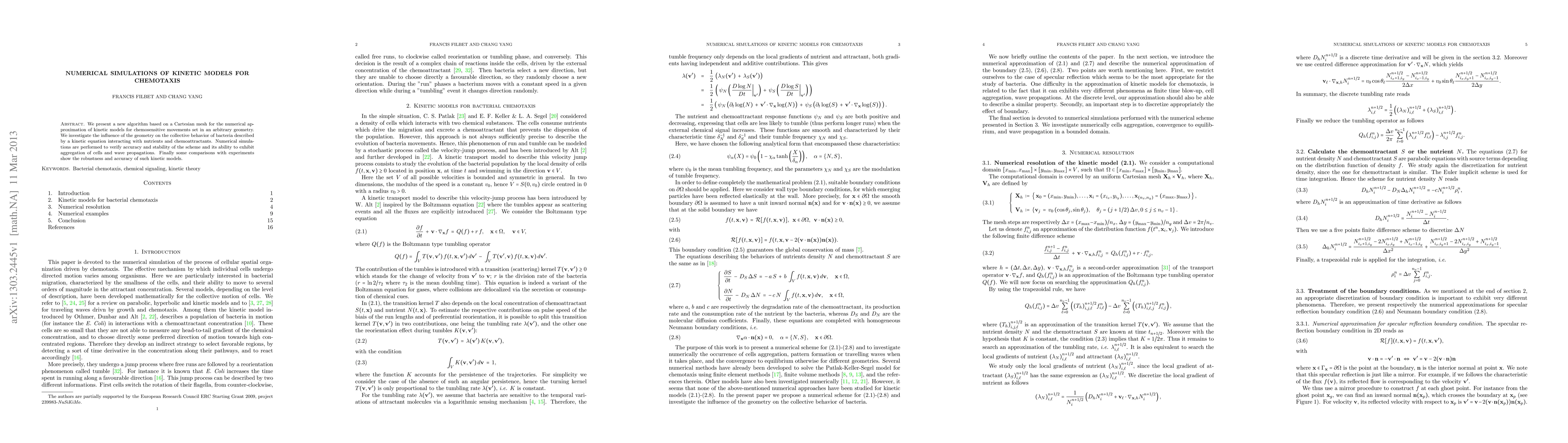 This research paper presents a new algorithm for simulating chemotaxis in bacteria using a Cartesian mesh, demonstrating the influence of geometry on collective behavior and its robustness through comparisons with experiments.